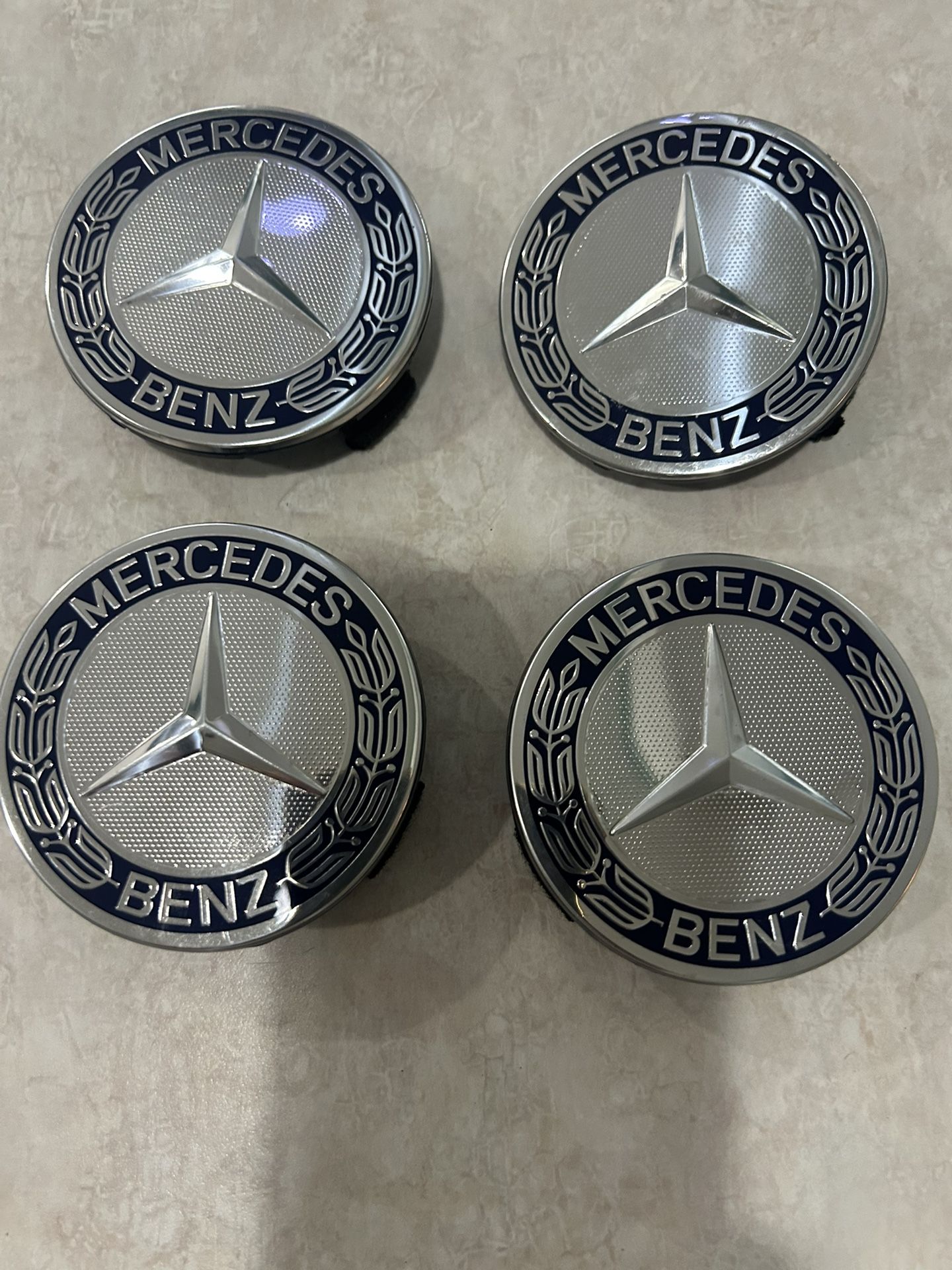 4 Mercedes Benz Wheel Center Caps Part Number: 171 400 00 25. Blue Wreath and Silver One has one broken clip.