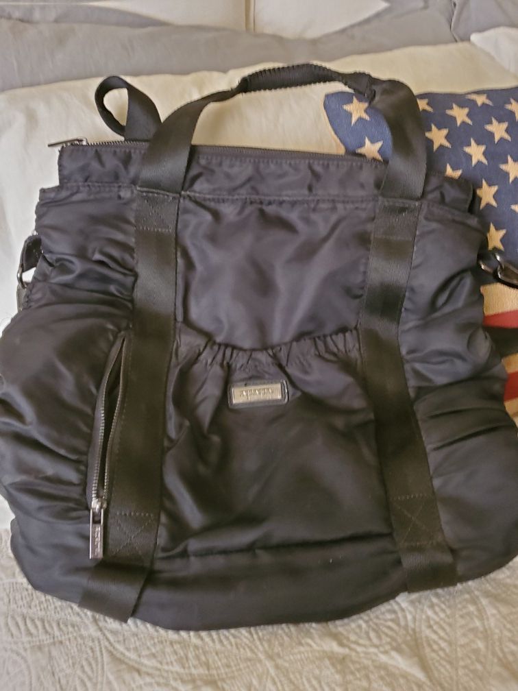 This is a large yoga bag with lots of pockets both on the inside and outside. Has an adjustable shoulder strap and 2 small handles