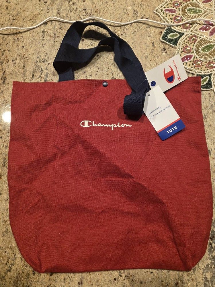 [Champion Red & Blue Fabric Tote Bag] Brand new with tags. Red with navy blue straps. Button closure with a few interior pockets. Approximate dimensions are 16" wide x 17" tall.