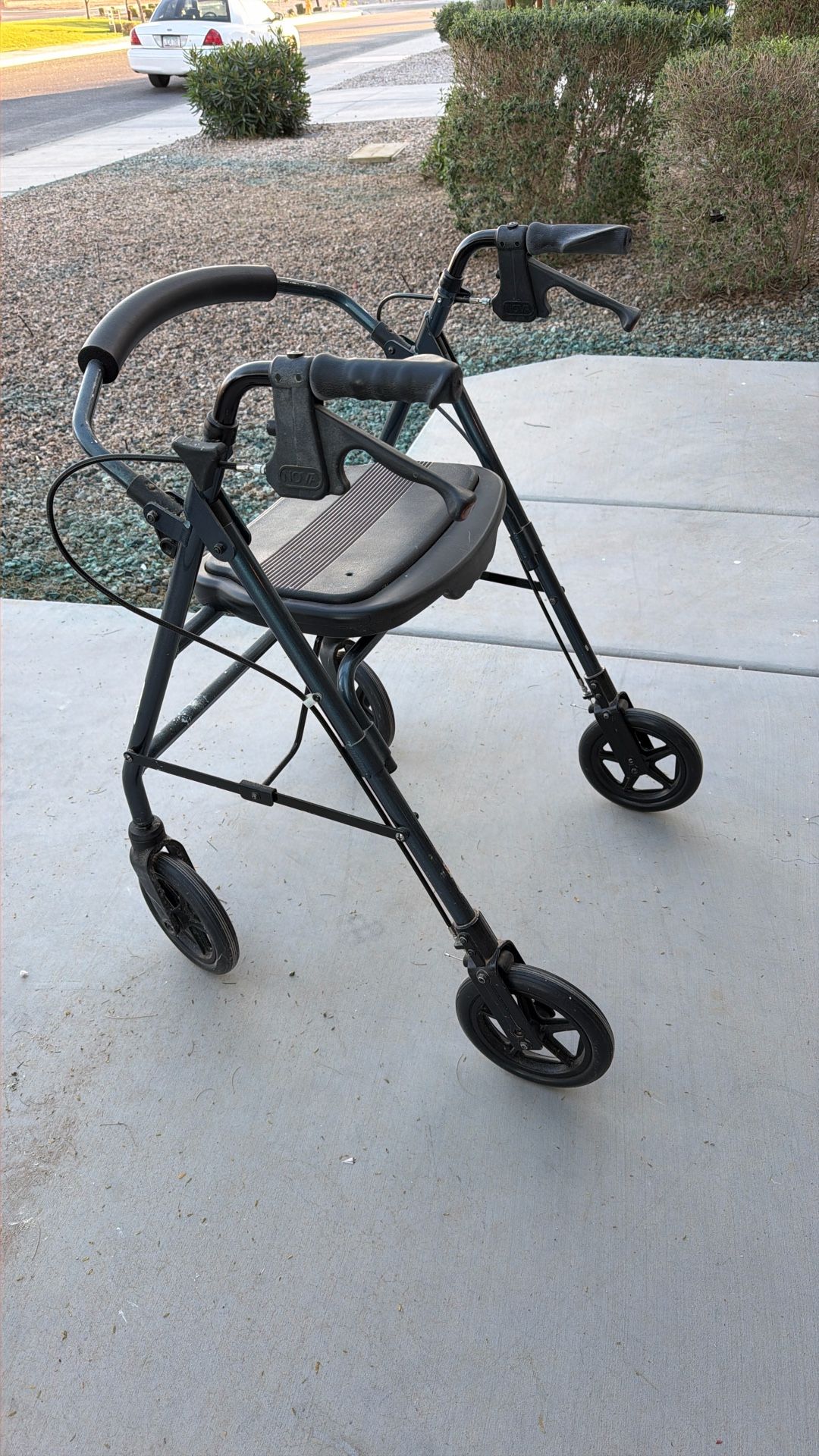 Four wheeled walker with brakes. Located in Maricopa, Arizona, Chandler 202 freeway. Just needs to be cleaned up.