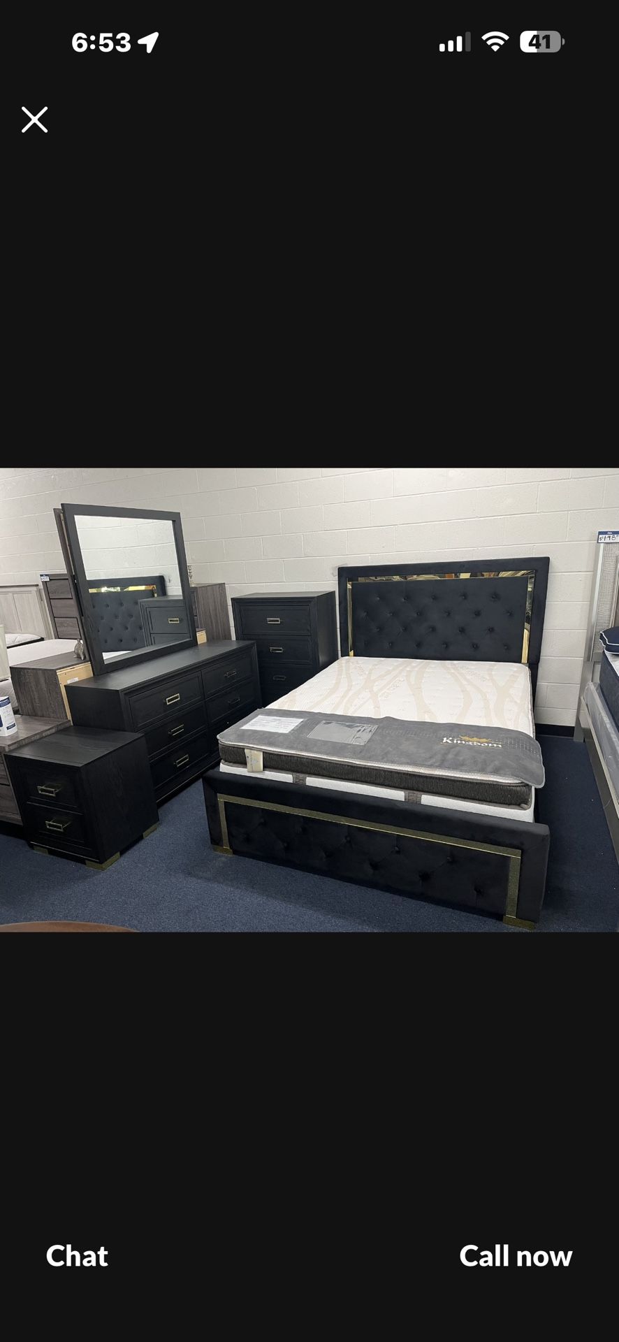 Only a year old. Black velvet with gold trim . Bed, night stand and dresser with mirror . Small crack in mirror