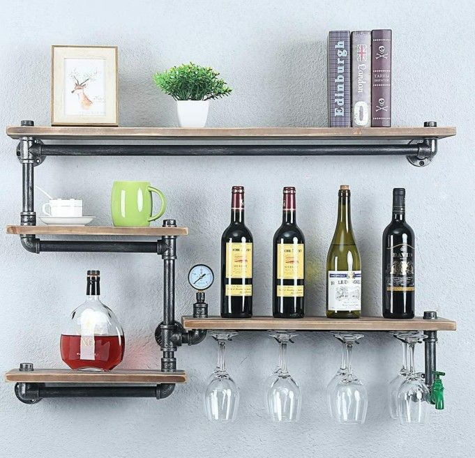 Distressed decor: industrial pipe and baking varnish, recycled pine wood. 【Size】: length 100 cm x height 50 cm x depth 20 cm. The thickness of the board is 2 cm. Easy to install: with the instructions (English language not guaranteed). but the product is heavy, assembly requires two people to cooperate. 【Built-in Wine Rack】Multi-layer rack with 4 stemware glasses offers you plenty of space for wine, wine glasses, books, decorations. PERFECT GIFT:This tube shelf is perfect for the kitchen/living room