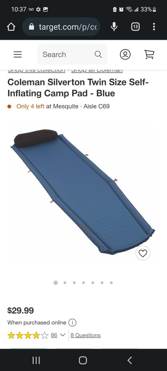Coleman Silverton Twin Size Self-Inflating Camp Pad - Blue Highlights Free-flow valve inflates and deflates with no need for a pump Adds a layer of padding between floor and sleeping bag Side bumpers keep sleepers from rolling off Attached storage bag reverses and doubles as a pillow when stuffed Tough, reinforced ripstop polyester cover resists tears Description Enjoy additional support and cushioning with the Coleman Silverton Self-Inflating Camping Pad, which adds an extra layer of padding between your sleeping bag and the ground. For ultimate convenience, a free-flow valve automatically inflates the camping pad when opened with no need for an air pump. When it's time to pack up, re-open the valve and push the air out. Thanks to its tough, reinforced polyester cover, this camping sleeping pad will add to your comfort night after night. - Free-flow valve automatically inflates when opened and easily deflates without a pump - Tough, reinforced ripstop polyester cover resists tears - Attached storage bag reverses and doubles as a pillow when stuffed - Roll Control design keeps pad straight as you roll it up - Side bumpers reduce the chance of rolling off while asleep - Inflated dimensions: 76 x 22 x 1.5 inches; weight: 2.9 pounds Specifications Dimensions (Overall): 76 Inches (L), 22 Inches (W), 1.5 Inches thick Weight: 2.9 PoundsDimensions (Packed): 4.25 Inches (H) x 15.5 Inches (W) x 16.75 Inches (D) Features: Self-Inflating, Built-In Pillow Recommended Capacity: 1 Person Shell Material: Polyester Care & Cleaning: Machine Wash