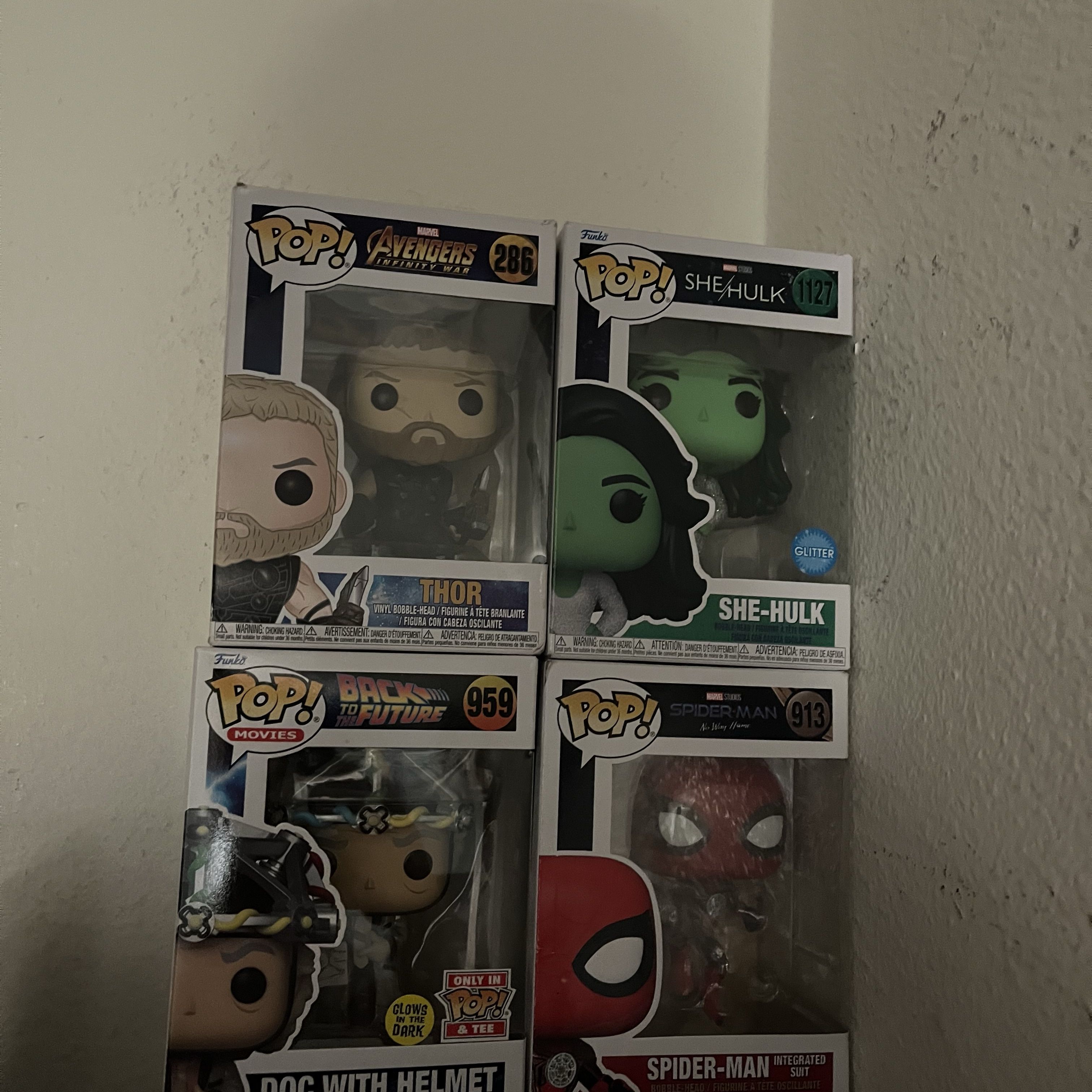 Marvel collection featuring Thor, She-Hulk, Spider-Man Funko Pops and Back to Future Doc with Helmet Pop figure. All in original boxes. NEVER OPENED 10 For each