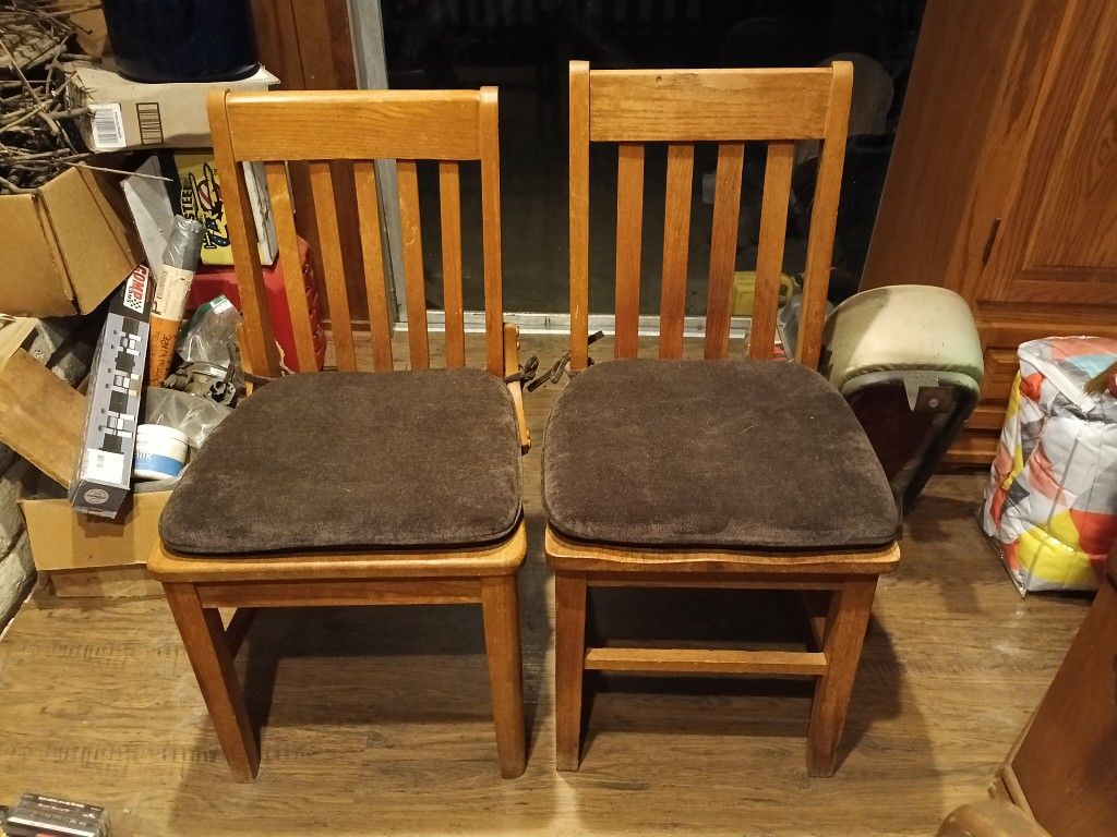 I will not respond to "is it available" that ad will be deleted upon sale. Two vintage wooden chairs with cushions. Good used condition. $20 for the set