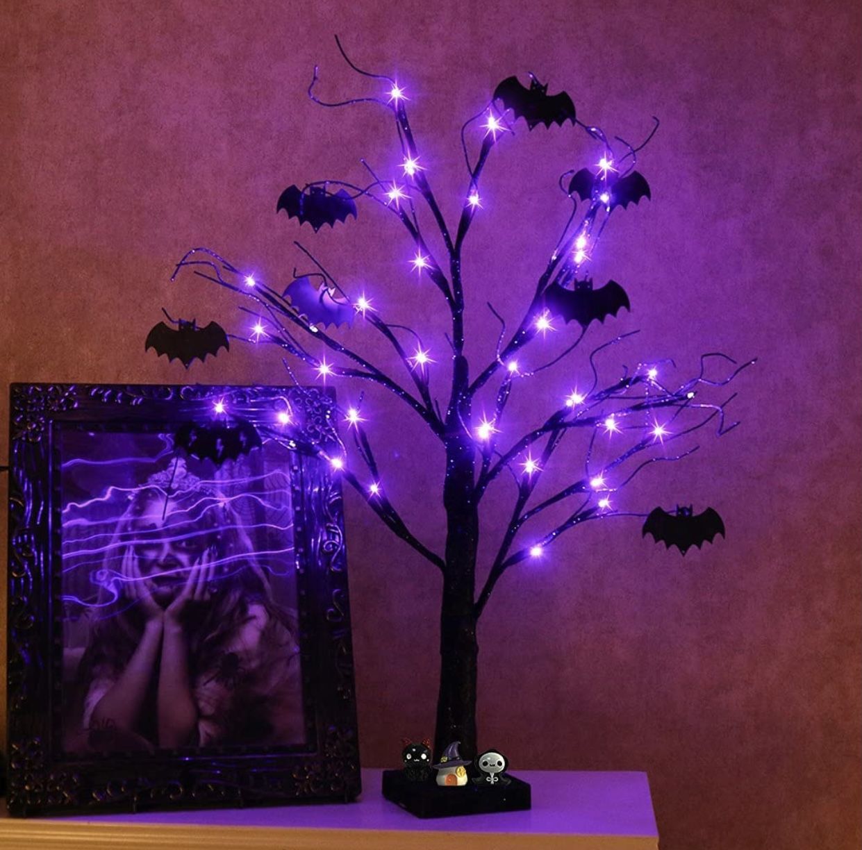Vanthylit 2FT 24LED Black Spooky Tree Glittered with Purple Lights and Bat Decorations Battery Powered Tabletop Bonsai Tree Decoration for Halloween