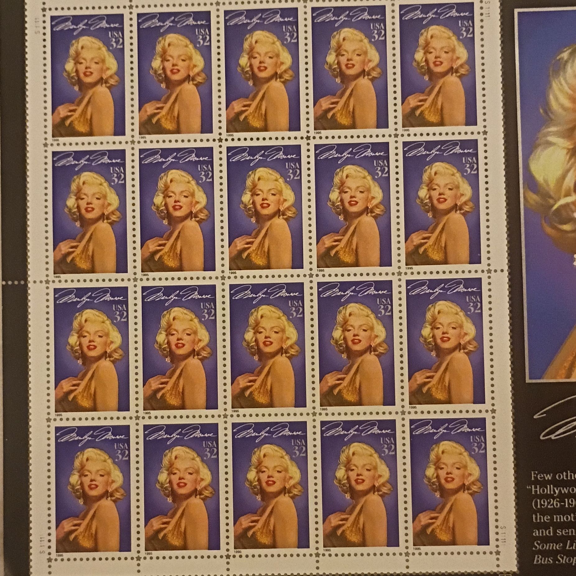 Large assortment of stamps including 1 cent stamps and collectible Marilyn Monroe and Lucille Ball stamps sheets