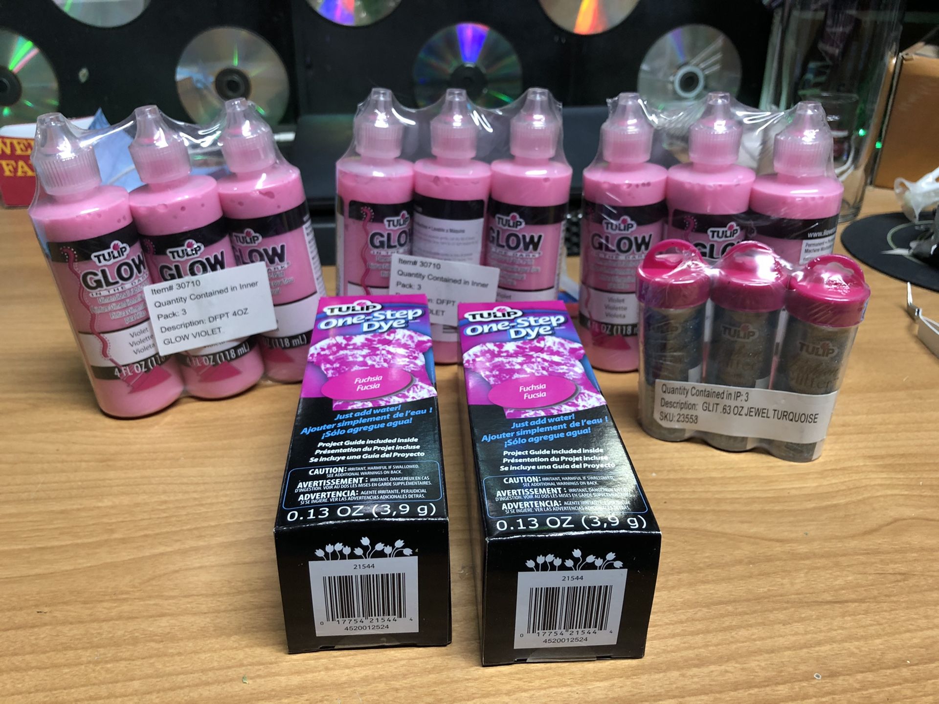 selling these extra craft supplies i have left. its ( 3 ) 3-pack glow in the dark pink fabric paint ( 2 ) one step dye kit ( 1 ) 3 pack fashion glitter so if you need to do something over the weekend with your daughter(s) well here a perfect crafting kit to keep them busy and creative over the weekend . hope you enjoy .