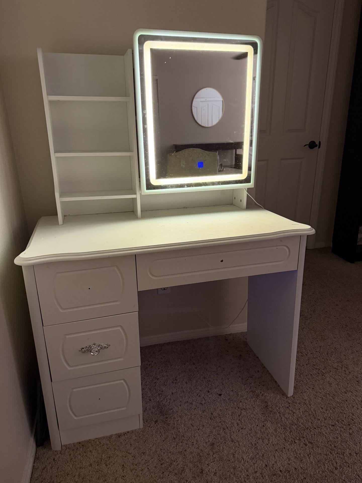 White vanity, steady condition. Light up mirror that slides open. Missing drawer details