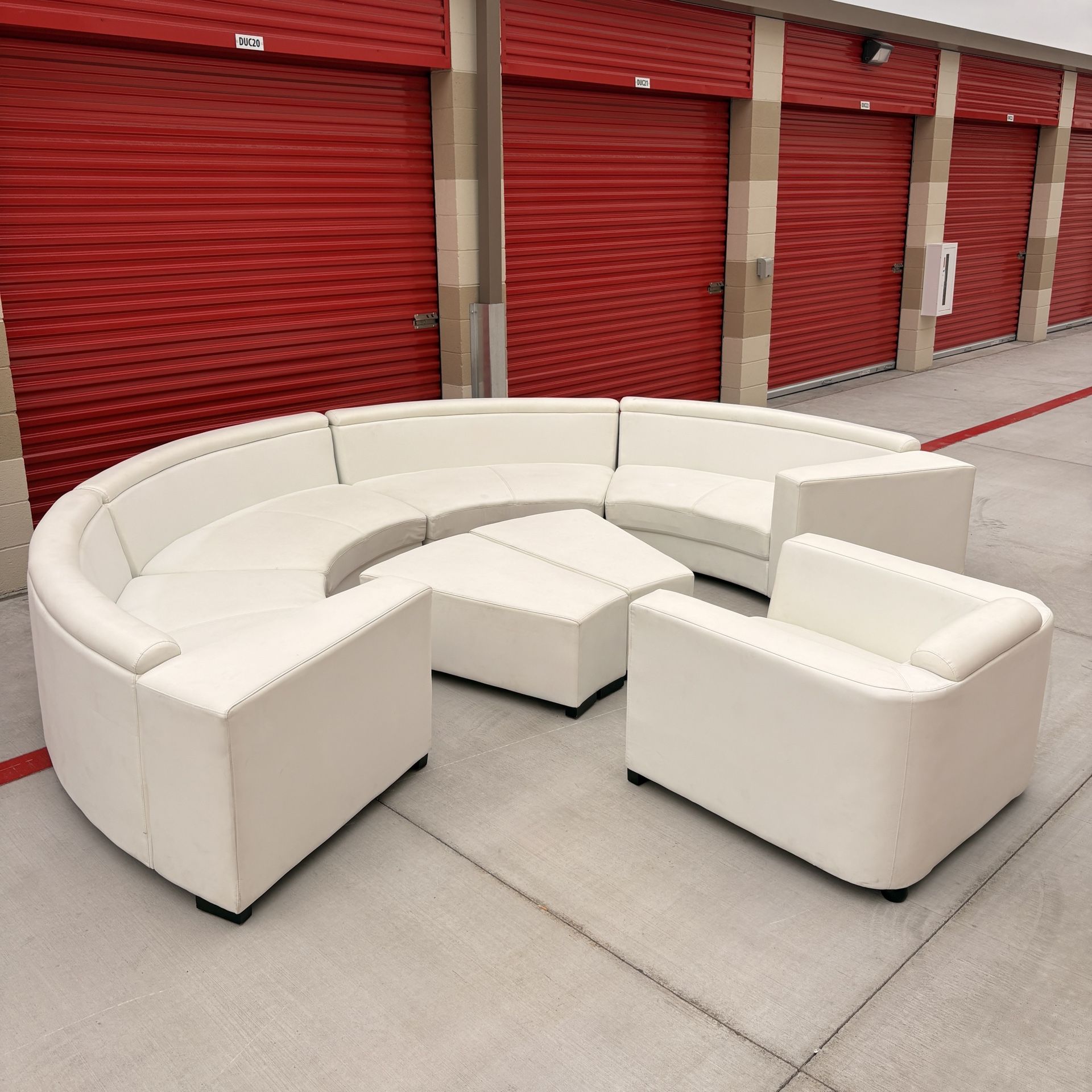 White half moon leather sectional in white with matching ottoman & sofa chair Lightly used in great condition no damage 14ft diameter Asking $999 (delivery available)