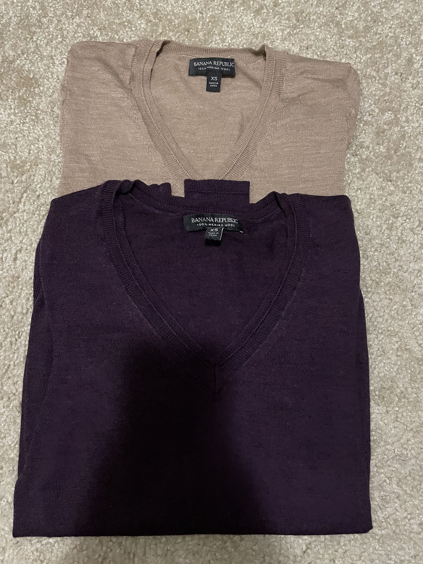 Banana Republic 100% merino wool v neck long sleeve sweaters in tan/beige and plum/violet. Size extra small. Women’s. These are from the regular BR store and not the Outlet one. Buy one for $12 each, or buy both for $20. Thanks for looking.
