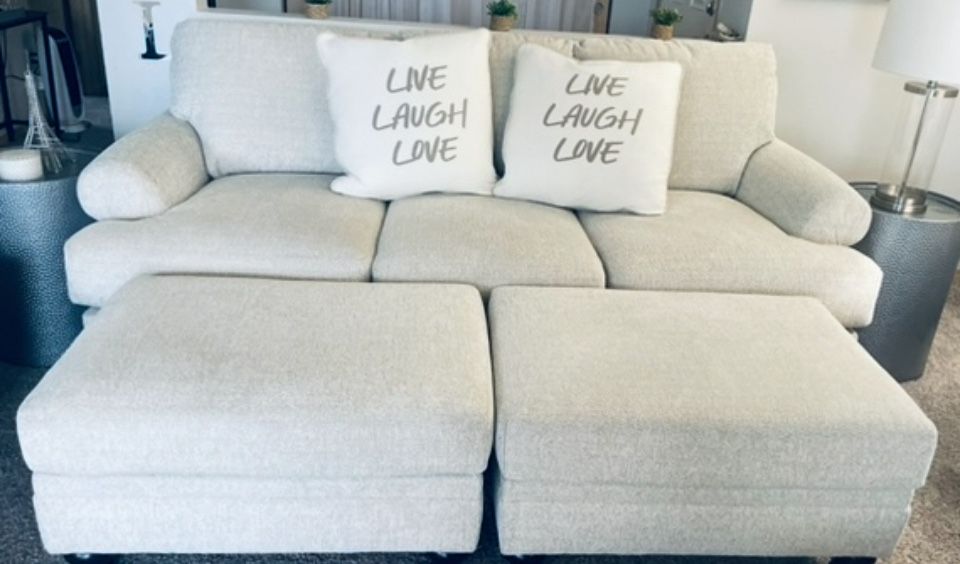 Like Brand New (only 2 months)! Upscale sofa couch with matching large, ottomans & throw pillows. See other listings as well. From floor to top of seat cushion - 20 1/2 inches. Espresso feet. See video of this is in Facebook Marketplace. Smoke/pet free home, no stains, rips or tears. Superior supportive seat and back, luxury quality and high end made. Pick up only. 2nd Floor Unit. DM in Facebook Messenger. Firm on price -