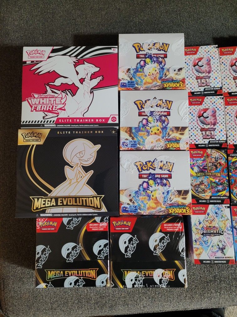 Up for sale is a huge sealed Pokémon lot in new un opened condition cash only pick up. 24 fantasmal flames blister packs 10ea 2 mega evolution etb 75ea 5 mega evolution booster bundles 45 ea 1 white flare etb 70 ea 1 whiteflare bundle 45 ea 3 black bolt booster bundle 45 ea 2 paradox rift booster bundle 45 ea 2 journey together booster bundles 40ea 3 single packs of paldea evolved 25$ 5 single packs of journey together 30$ 5 scarlet and violet 151 390$ 3 surging sparks booster boxes 210 ea 3 mega evolution booster box 225ea All items are listed below market price Cash only pick up