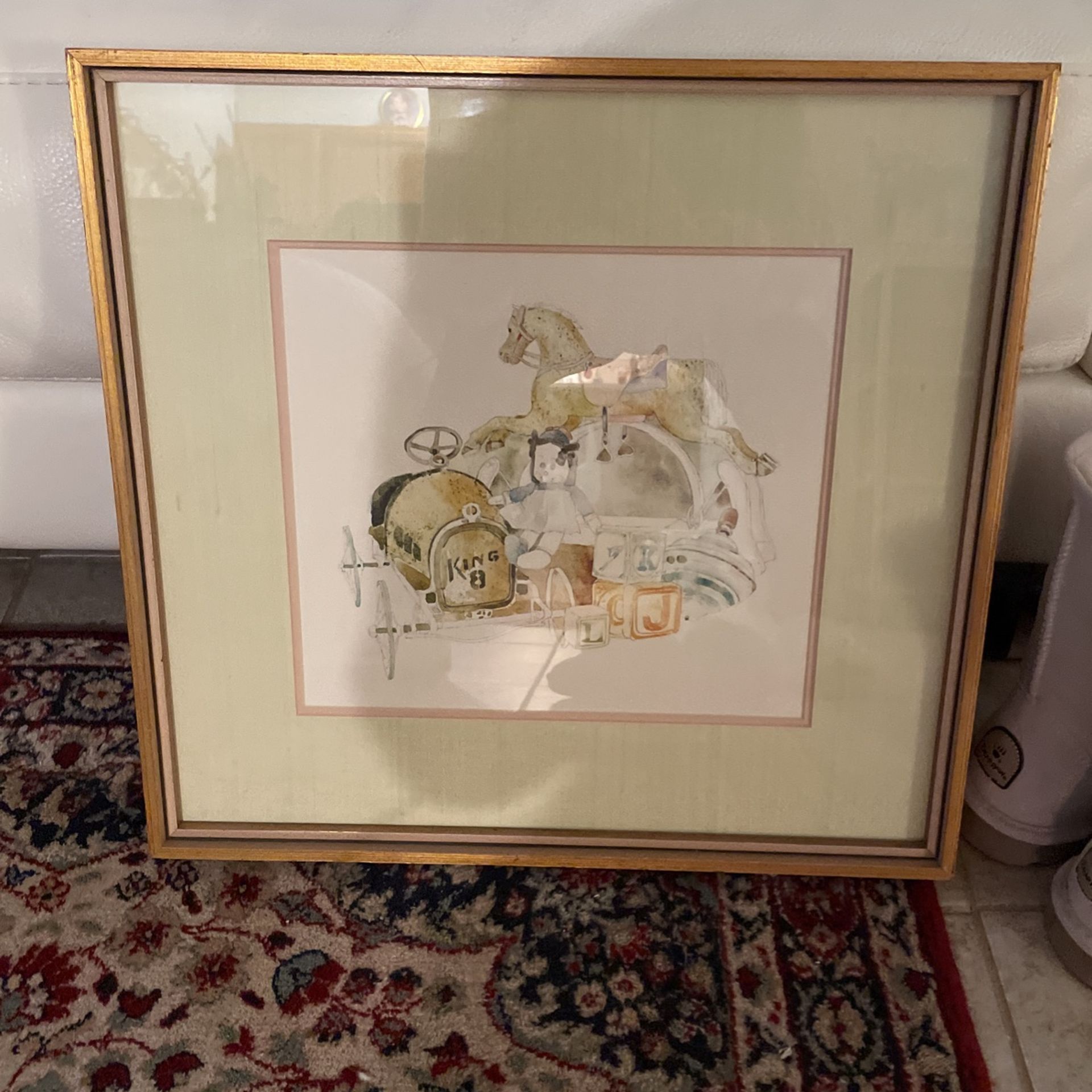 A watercolor painting framed for your baby’s room . Subtle yellow/green colors of baby toys.. can become an heirloom.. Excellent condition.