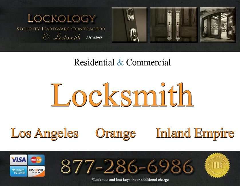 $59 Service Charge $15 Per Lock Rekeyed (Must provide existing keys) Call now to schedule an appointment today. Available Services: • Home & Business Rekey • Installation of New Locksets • Lockout & Eviction • Commercial Storefront Hardware • Electronic Systems • Masterkeying • And More! Locations Served: Agoura Hills, Alhambra, Arcadia, Artesia, Azusa, Baldwin Park, Bell, Bell Gardens, Bellflower, Beverly Hills, Bradbury, Burbank, Calabasas, Carson, Cerritos, Claremont, Commerce, Compton, Covina, Cudahy, Culver City, Diamond Bar, Downey, Duarte, El Monte, El Segundo, Gardena, Glendale, Glendora, Hawaiian Gardens, Hawthorne, Hermosa Beach, Hidden Hills, Huntington Park, Industry, Inglewood, Irwindale, La Cañada Flintridge, La Habra H8s, La Mirada, La Puente, La Verne, Lakewood, Lancaster, Lawndale, Lomita, Long Beach, Los Angeles, Lynwood, Malibu, Manhattan Beach, Maywood, Monrovia, Montebello, Monterey Park, Norwalk, Palmdale, Palos Verdes Estates, Paramount, Pasadena, Pico Rivera, Pomona, Rancho Palos Verdes, Redondo Beach, Rolling Hills, Rolling Hills Estates, Rosemead, San Dimas, San Fernando, San Gabriel, San Marino, Santa Clarita, Santa Fe Springs, Santa Monica, Sierra Madre, Signal Hill, South El Monte, South Gate, South Pasadena, Temple City, Torrance, Vernon, Walnut, West Covina, West Hollywood, Westlake Village, Whittier Keywords: Locksmith, Locksmiths, Residential Locksmith, Commercial Locksmith, Unlock, Unlock Service, Business Locksmith, Lock Repair, Lock Installation, home security, Lock Smith, Lock Smiths, locksmith service, mobile locksmith, emergency unlock, emergency opening, door unlock, key making, entry doors, door repair, garage door repair, garage door replacements, Residential Lockouts