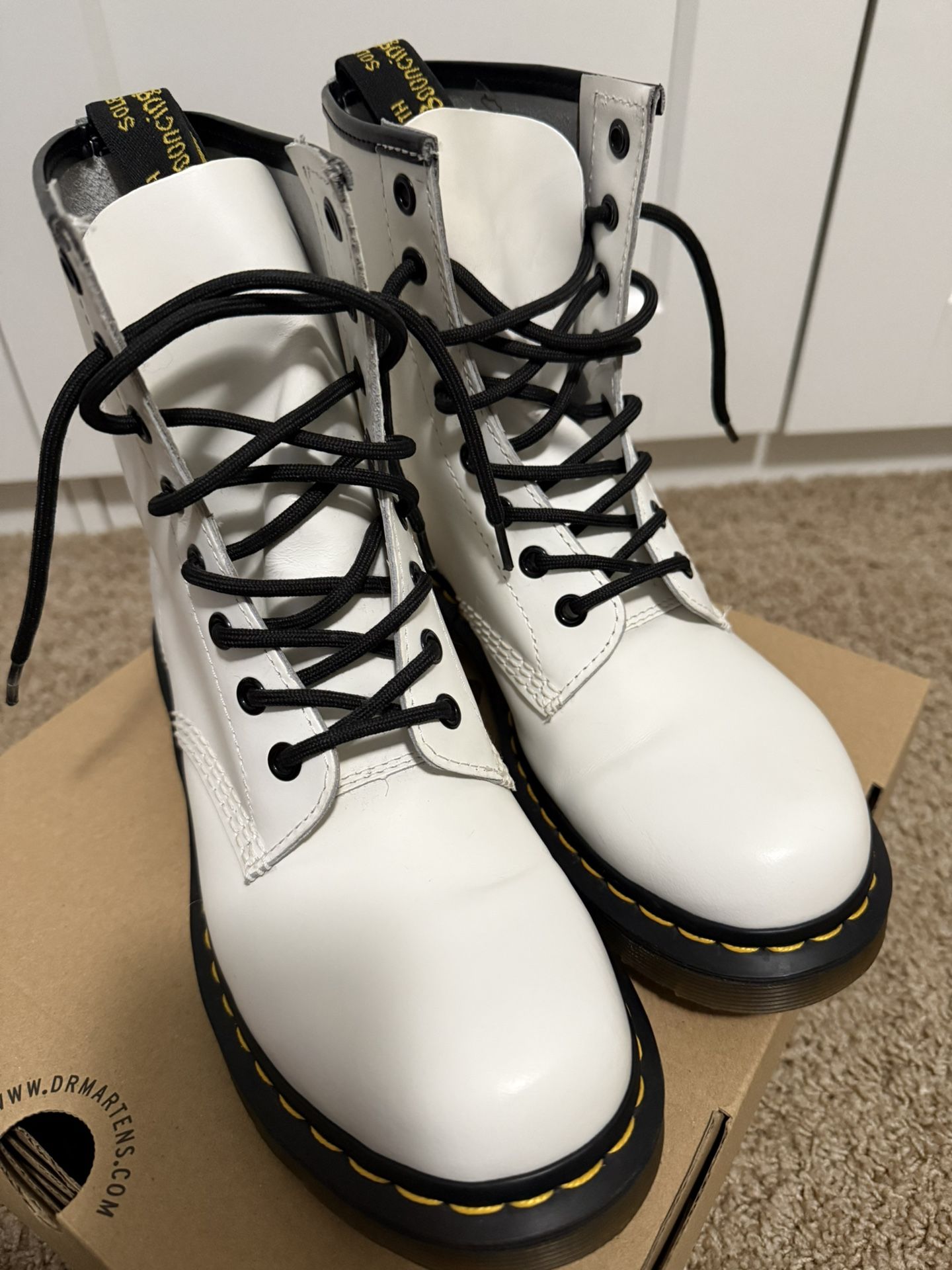 Classic white leather Dr. Martens boots. Durable black laces. Signature yellow stitching. Ideal for bold fashion. Excellent condition.