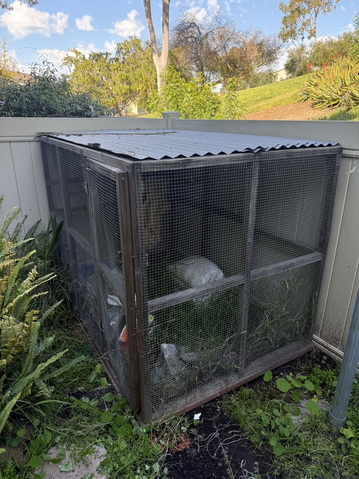 Hutch with perch and cement blocks all around underneath. Great outdoor animal home! Must come and dismantle to pick up.