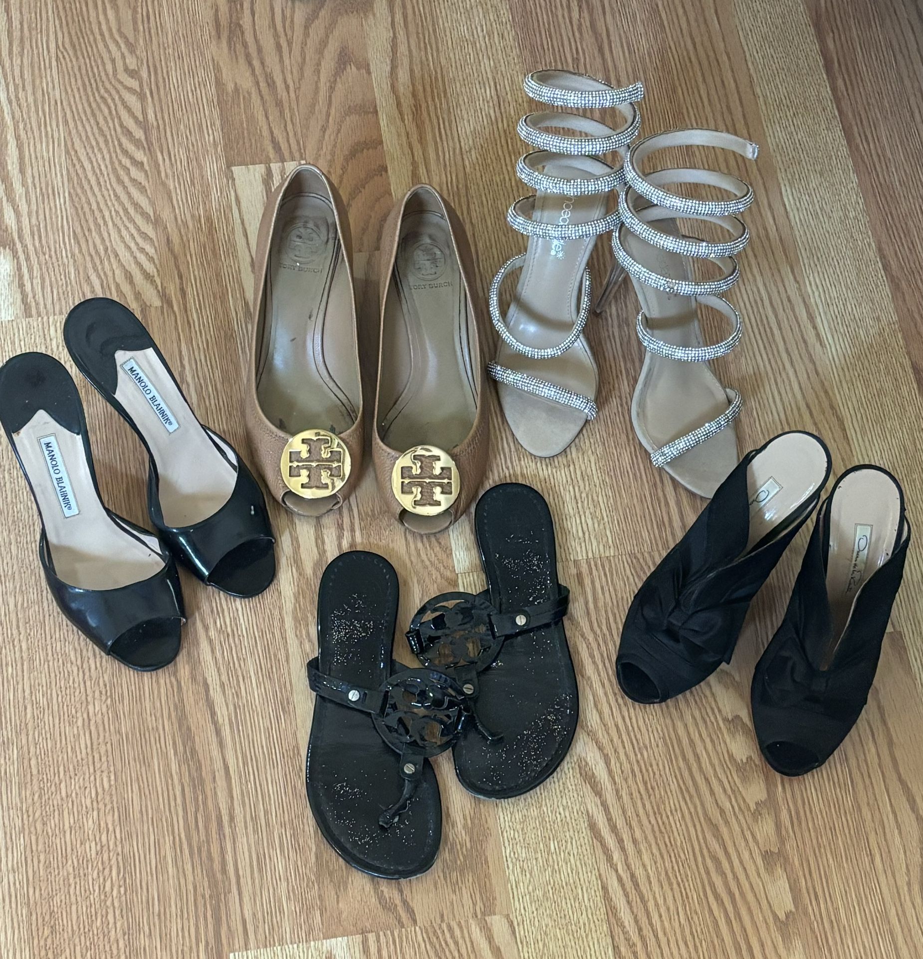 Beautiful shoe lot normal wear with lots of life left. sparkly heels are brand new. Sizes between 7.5 and 8.5 because designer shoes run small.