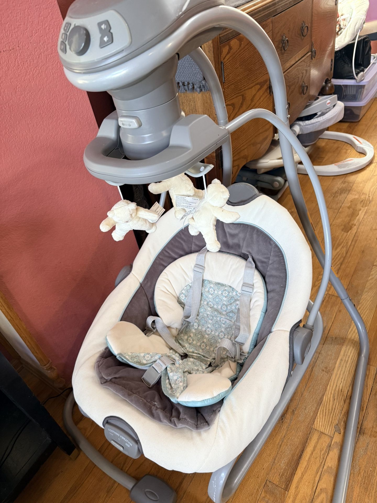 It swings perfectly fine, it plays music, and it plugs into the wall. There is paint on it but we bought it like that.
