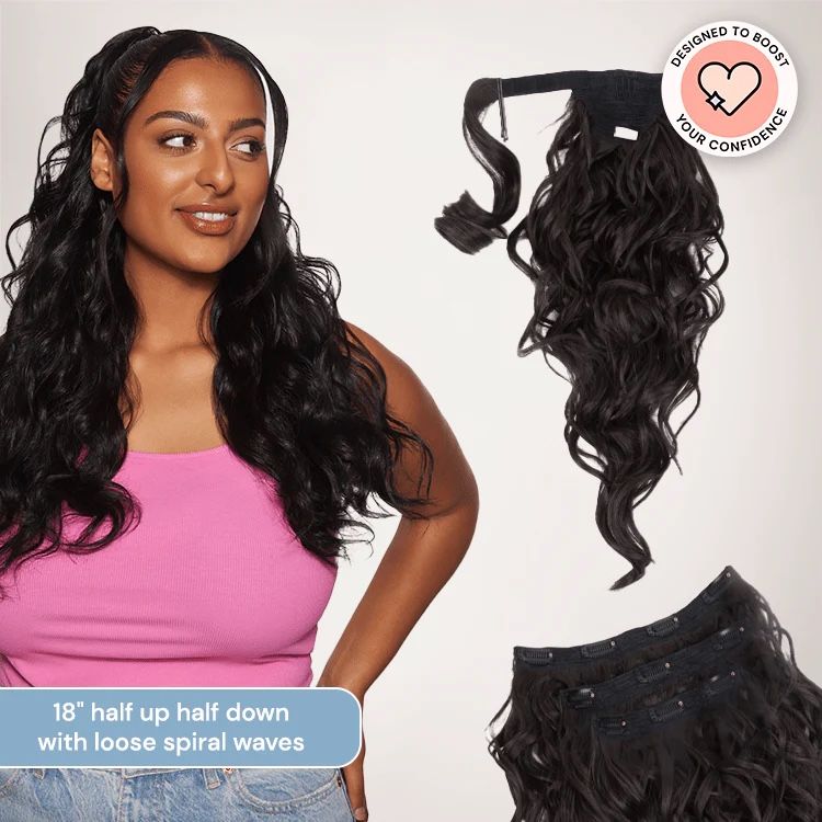 Brand new Chloe is a 4 piece clip-in set that includes 1 mini ponytail and 3 wefts with loose spiral waves. Whether you want to use all 4 pieces for a voluminous half up half down look or just a few to spice things up, the possibilities are endless with Chloe.