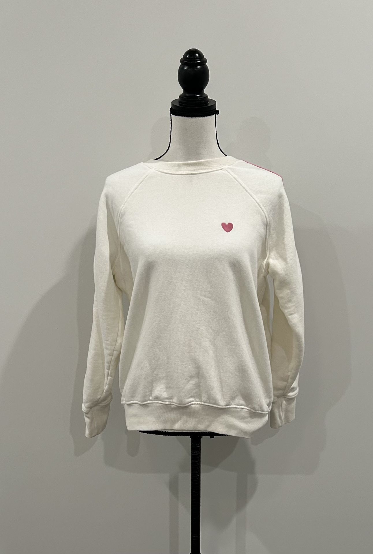 Spiritual Gangster sweatshirt. Cream with pink, blue, red, black, and gold details. Pink heart embroidered on left chest. Pink, red, light blue, and navy stripes down the sleeves. Crewneck. Long sleeves. Heavier weight. Back says, “We are more,” and then is signed Spiritual Gangster. Size XS. Approximate Measurements: Pit to pit - 22” Shoulder to hem - 23” 100% Cotton 19