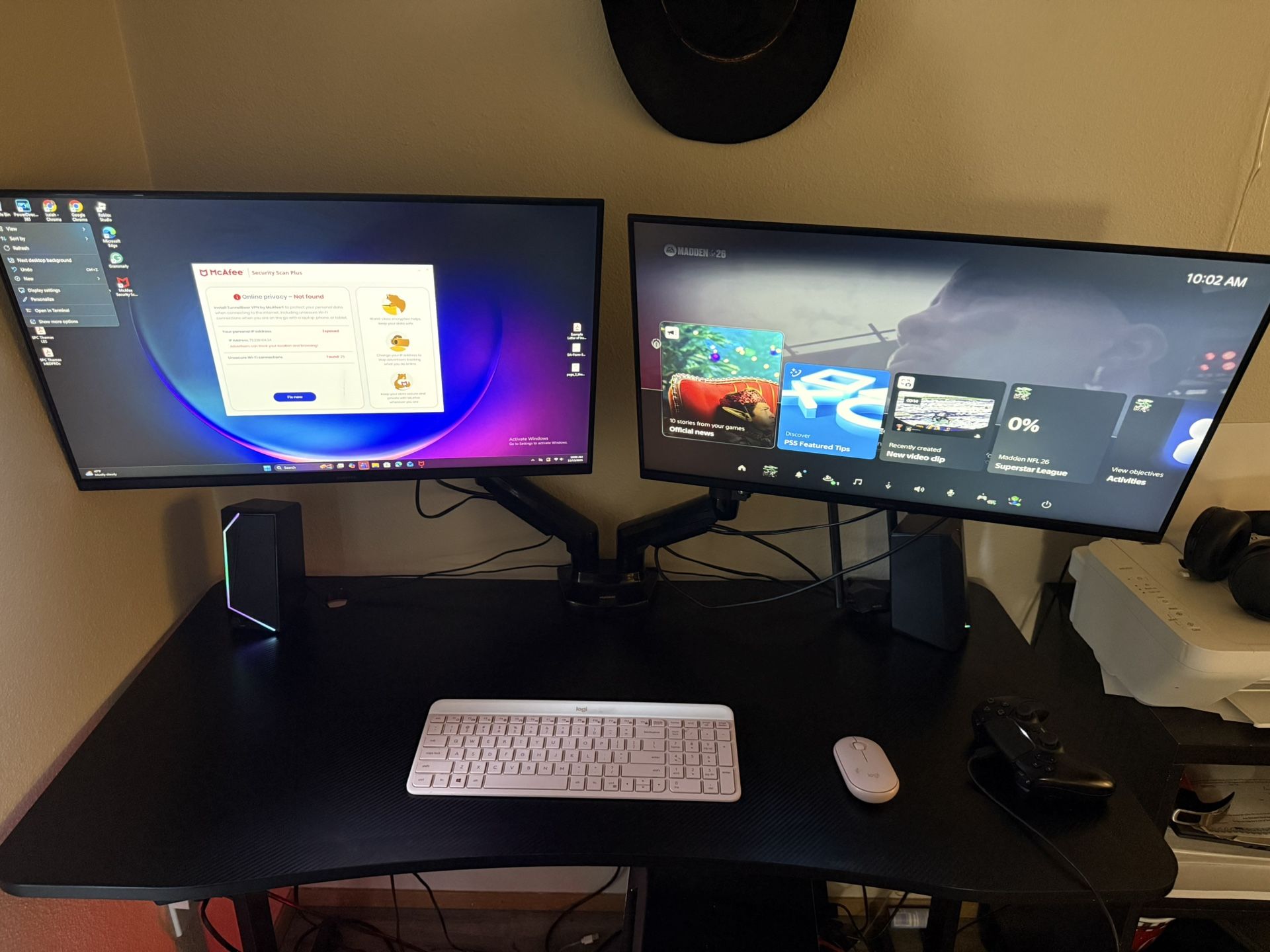2 monitors with adjustable desk mounted arms, desk is included in price, also comes with gaming gpu as pictured I do not know the specs for it but feel free to ask questions. 2 wired led speakers and a RAZOR huge mouse pad.