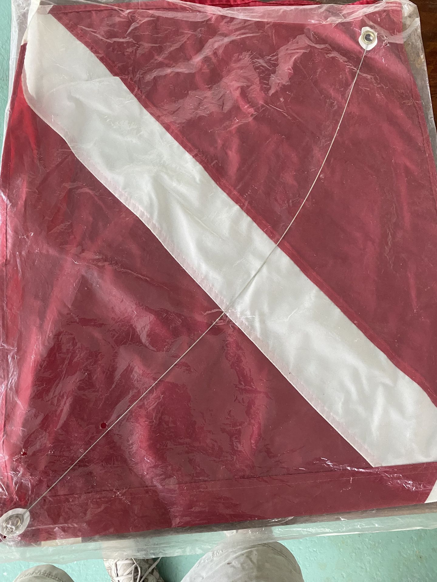 20x24 dive with brass grommets on four corners and a diagonal wire to keep it visible.bought it but never used