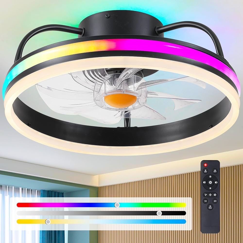 Ceiling Fan Low Profile Ceiling Fan with Light Modern Flush Mount 13" RGB LED Bladeless LED-RGB Ambient Light Black for Bedroom, for Kids Room, Dimmable, Enclosed, for Party
