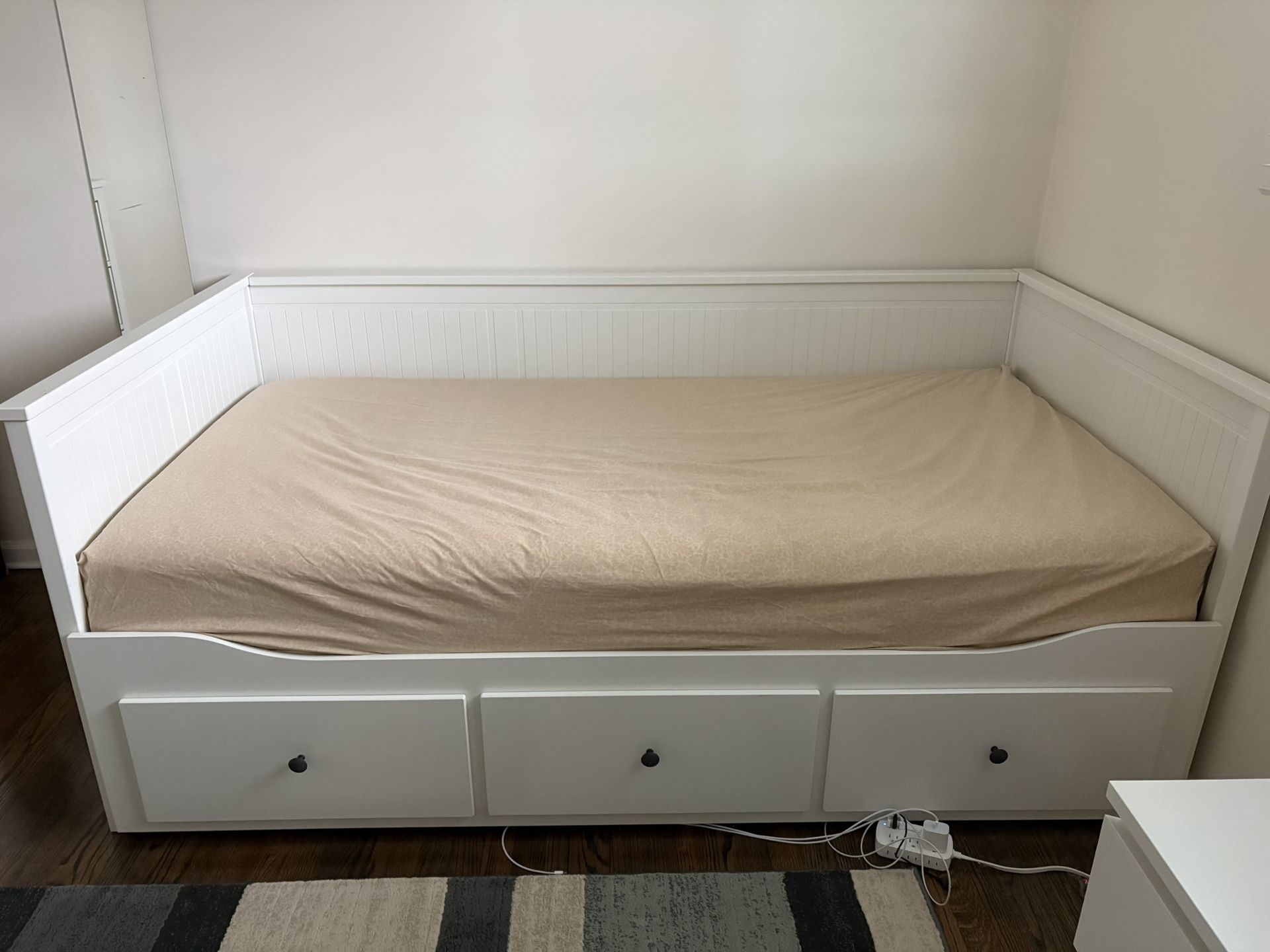 Selling a fully assembled Ikea daybed. Comes with 2 mattresses, 3 storage drawers, and a built-in slide in trundle. Measurements: Height is 32 inches, Width is 40.5 inches and Length is 78 inches. Good condition, Ikea sells for $700 plus tax. We are selling for a low price of $450, if interested, local pickup in Lombard at the intersection of Roosevelt Rd and Main St.