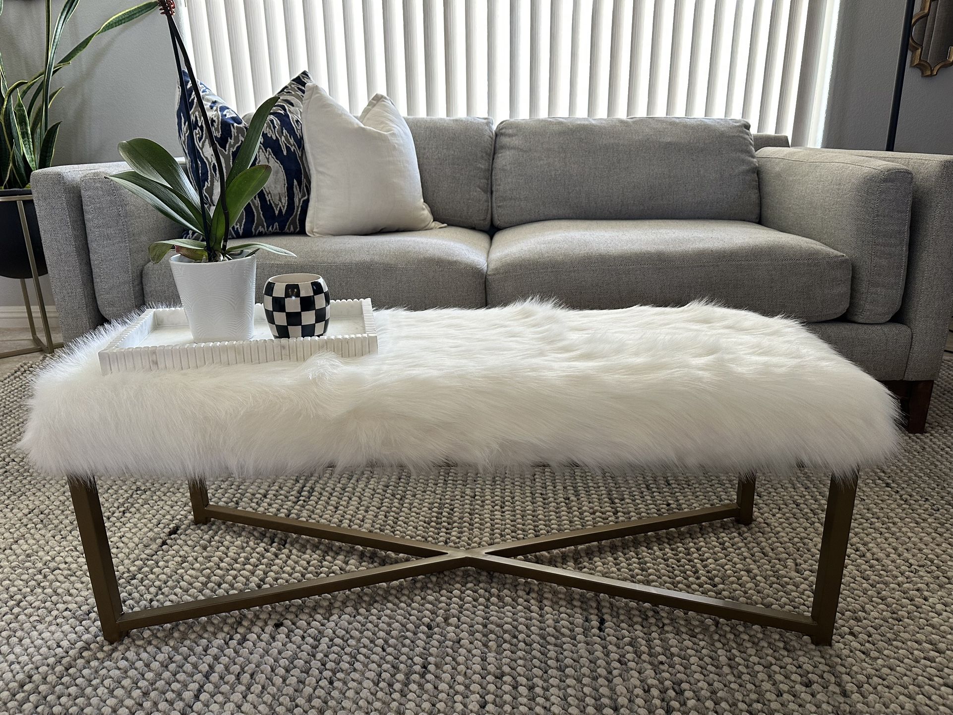 Beautiful designer inspired fur bench. No scratches, no stains. Want something larger for area. Measurements are 17 inches tall, 17 inches wide and 45 inches long