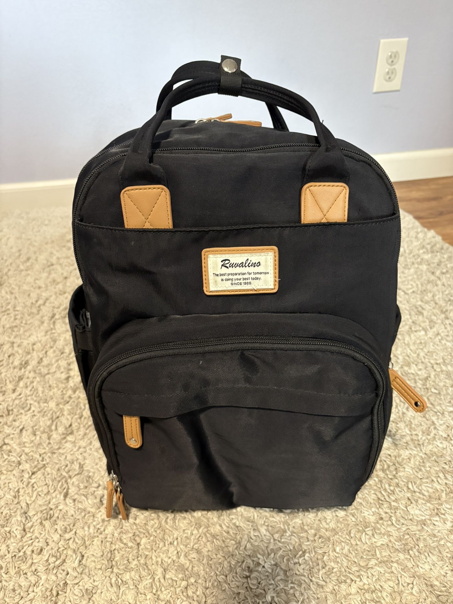 Used Ruvalino, black diaper bag. Lots of storage/organization options. No rips or snags. White tag logo has small signs of wear, but other than that it’s in great condition. Kept it in case we needed it still, but never used it again.