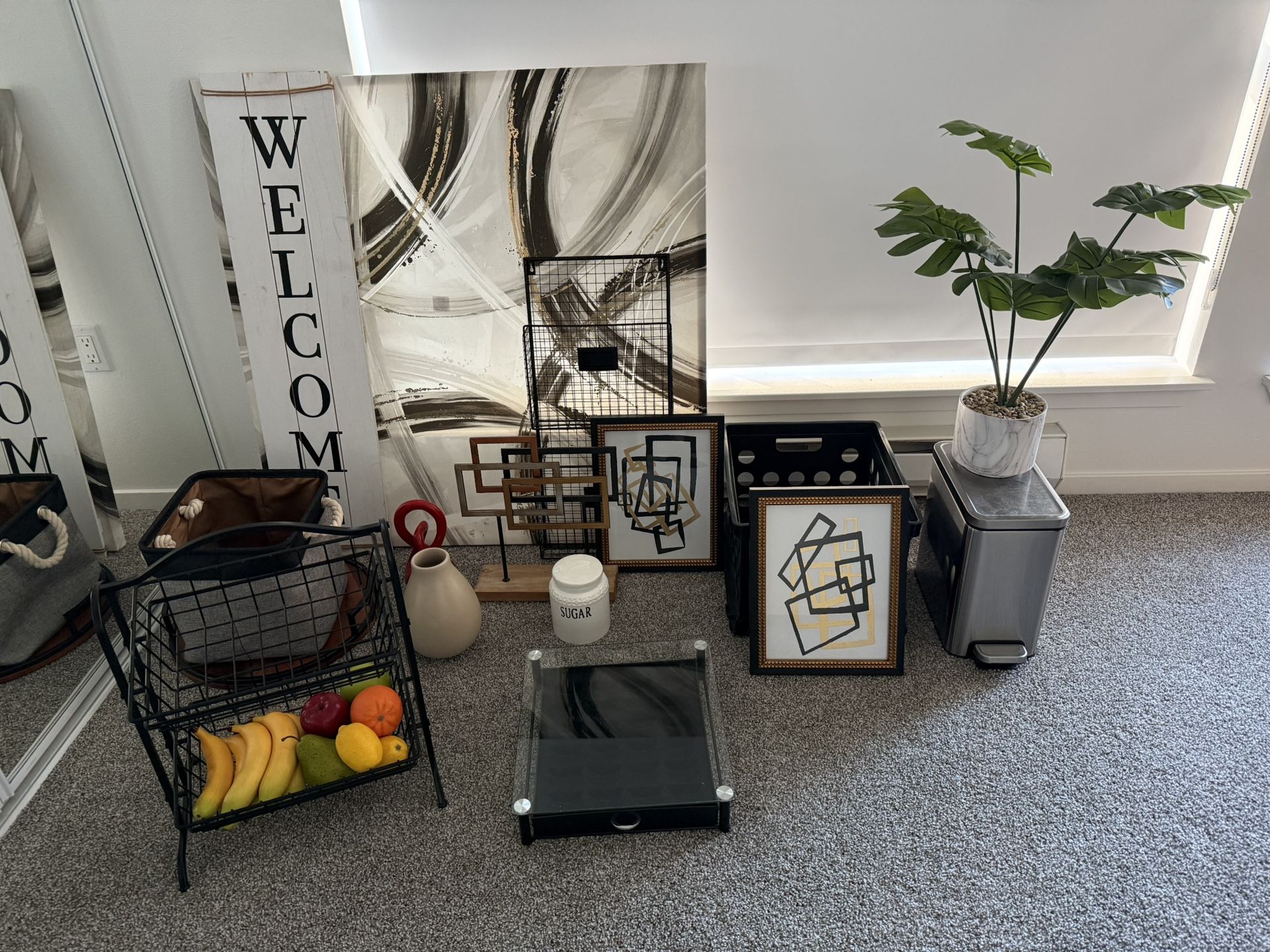 Faux plant with marble pot: $10 Trash can: $15 Wall decor photos: $10 each Gold/Black decor: $10 Plastic crate/basket: $5 Red decor: $10 Sugar jar: $10 Brown pot: $10 Nespresso Duo stand: $25 Mail holder: $10 Fabric basket: $10 Wood/Metal tray: $15 Kitchen fruit basket: $25 Welcome sign: $10