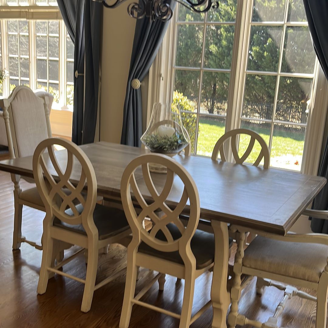 Kitchen table and chairs. 72” x 43”. Six chairs. Very sturdy. Some shallow scratches. Two upholstered chairs have some spots. Two matching counter height bar stools available at $50 each.