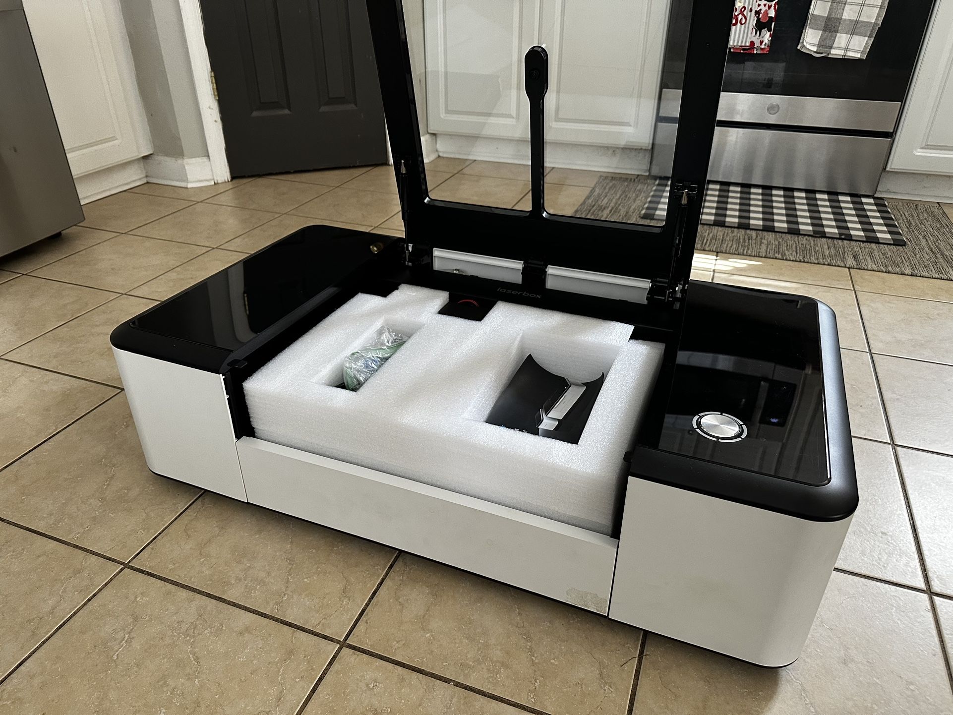 Laserbox Pro laser cutting and engraving machine. Like new condition and comes in the original packaging. Comes with heavy duty desktop table that is height adjustable and an AC Infinity Cloudline S6 exhaust fan with all necessary accessories. Exhaust system has adjustable cfm output. Also comes with three boxes of 3mm wood sheets and two boxes of assorted colored acrylic sheets. Laser has built-in camera, autofocus, and safety certifications.