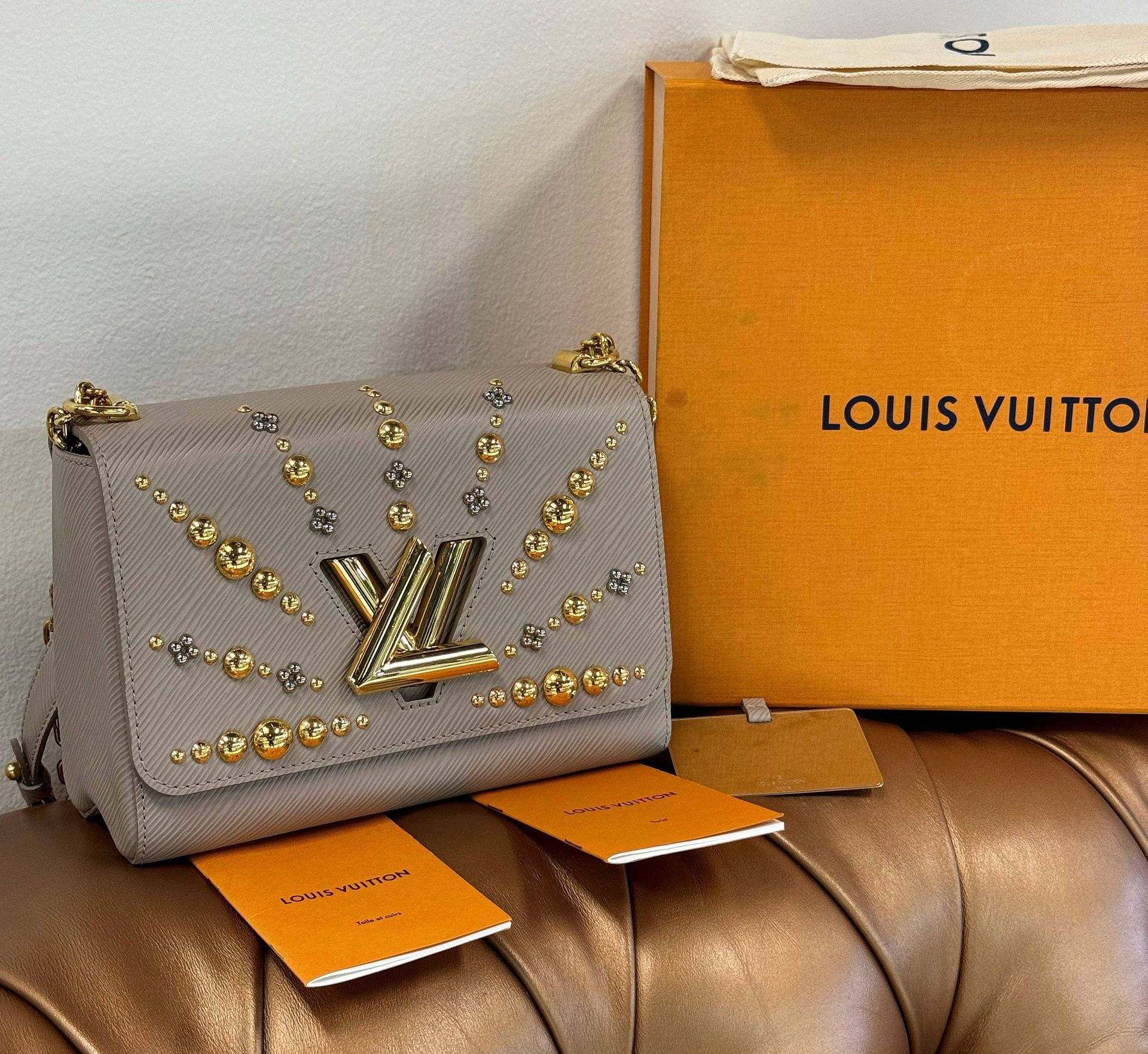 Louis Vuitton Twist MM Studded Epi Leather Handbag – Neutral – With Box & Dust Bag Elevate your look with the Louis Vuitton Twist MM handbag, crafted from luxurious Epi leather in a versatile neutral tone. This sophisticated shoulder bag features edgy silver-tone stud detailing and the iconic LV twist-lock closure for a modern yet timeless touch. The structured silhouette opens to a well-organized interior with a microfiber lining and a flat pocket—perfect for your daily essentials. Comes with box and dust bag, condition as shown on the pictures.