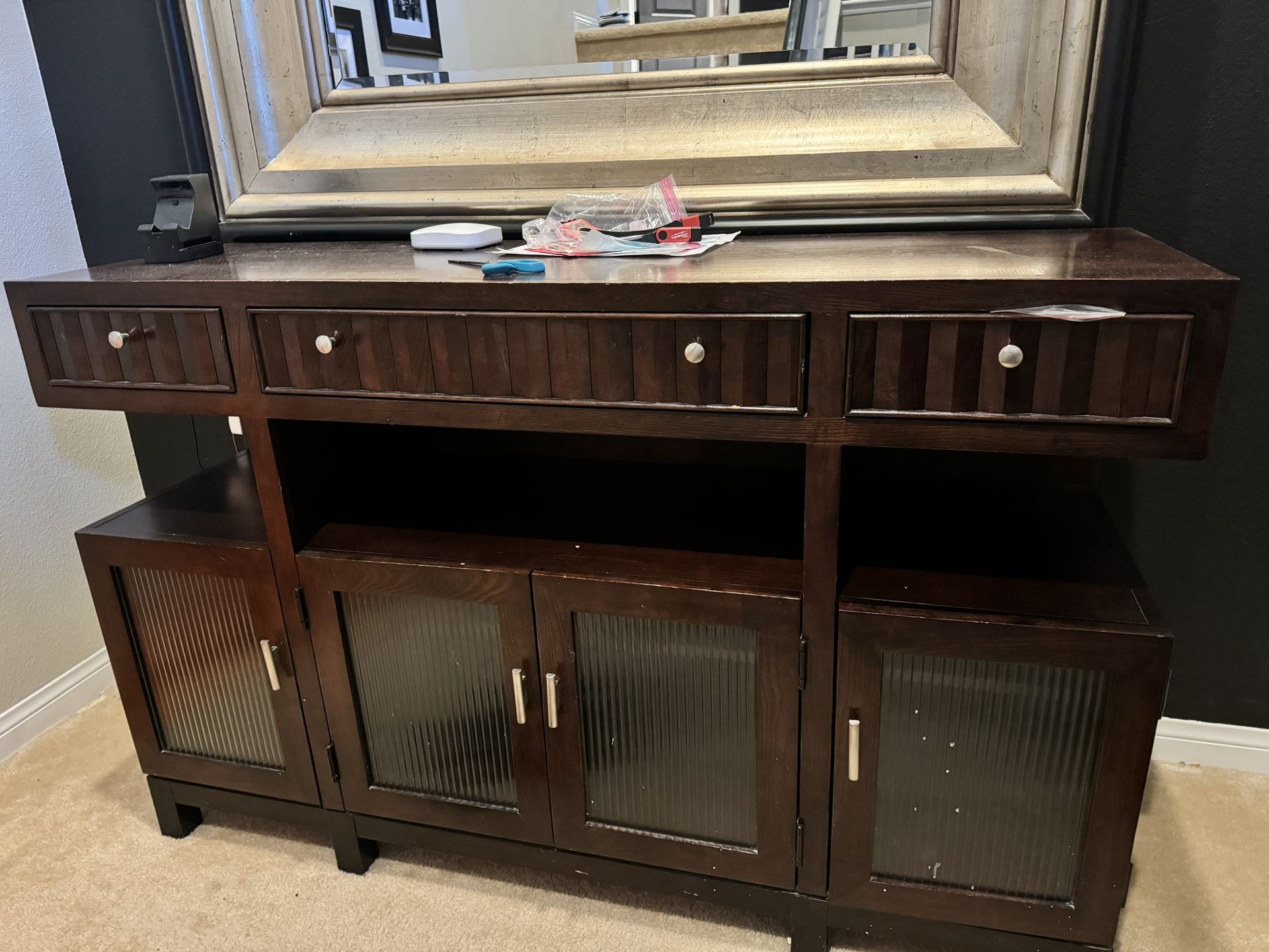 Solid wood. Needs a little TLC. You can sand and restain it.
