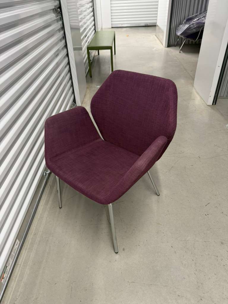 Keilhauer Cahoots Side Chair with arms, featuring purple upholstery and a polished aluminum 4-leg base 4 available Smoke free home Pet free home Excellent condition Keilhauer Cahoots side chair with arms Purple upholstered seat and back Polished aluminum 4-leg base Compact modern design for office or lounge seating Located in Lawrence, NY 11559. #C1188WA MEASUREMENTS: H: 30" x W: 26.5" x D: 25.25" x SH: 17" x AH: 23.75" 4 available $350 each $1,400 for the set