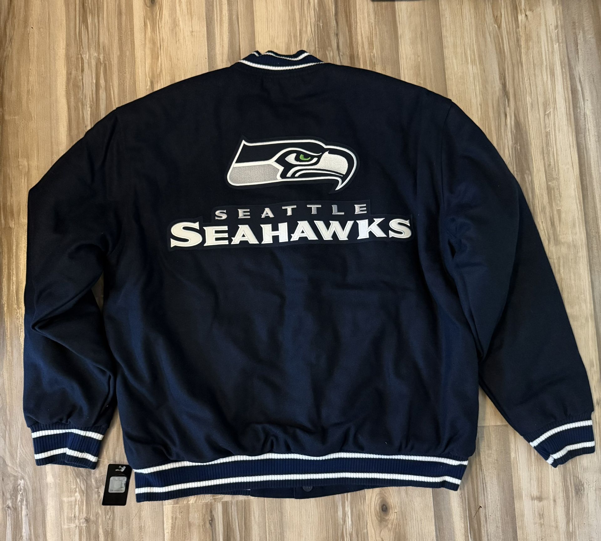 Brand new Seattle Seahawks Reversible wool varsity jacket All Blue Poly reversible side for weather Size XL