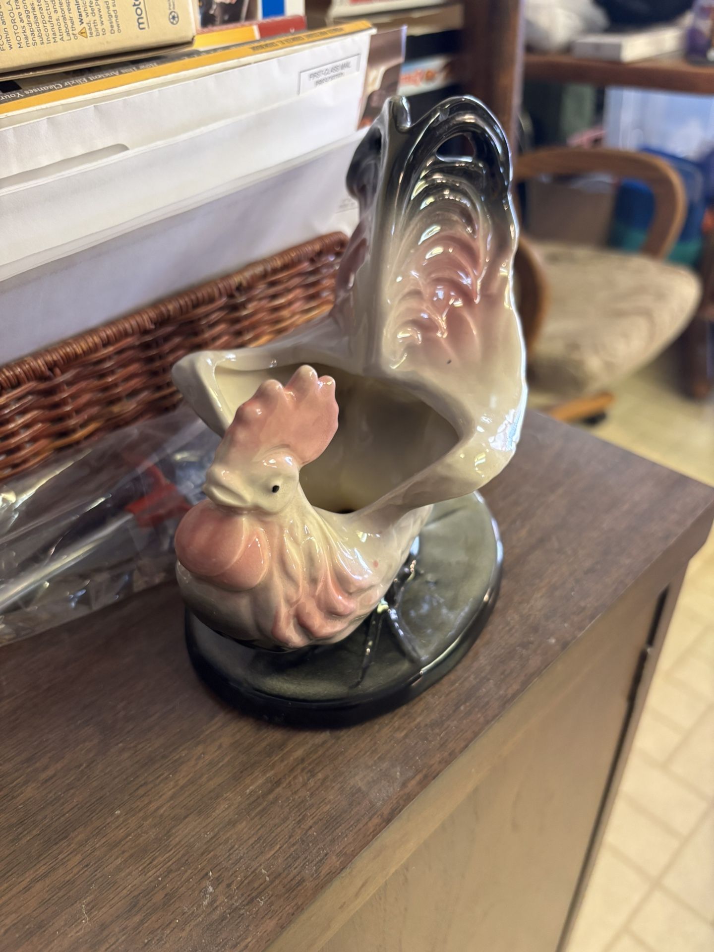 Adorable Planter Hull Rooster, beautiful color of blacks and pinks. No cracks or chips Measures 6" tall, 6 1/2" long and apprx. 4 1/4" across.