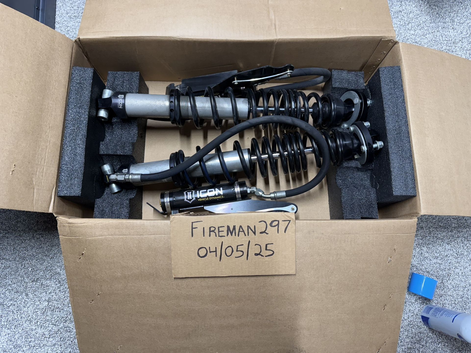 Kit includes the front and rear Icon coilovers and front Icon billet upper control arms. Brand new this kit was over $6500. ICON Vehicle Dynamics V.S. 2.5 Series remote reservoir front and rear coilover shocks with CDCV are an incredible upgrade for the 2021-2025 Ford Bronco. These adjustable coilovers allow up to 3-4” of lift height adjustability on Broncos without the Sasquatch package or 2-3” of lift over stock Sasquatch equipped Broncos, allowing the use of larger, more aggressive wheel and tire combinations. ICON’s Vehicle-specific shock length and valving along with the larger 2.5” shock body and increased piston area over stock components yield the maximum travel possible along with superior ride quality and suspension performance both on- and off-road. Reservoirs greatly increase shock oil volume and heat dissipation surface area to resist overheating and cavitation under hard use, which can lead to damper fade. ICON's exclusive Compression Damping Control Valves are included for precisely dialing in your suspension performance. CDCV controls fluid flow under compression, allowing you to achieve the perfect tune whether driving on the street, slow-crawling through the rocks or mobbing across the desert at full throttle. When paired with ICON 2.5 Series rear coilovers vehicle control will be balanced front to rear, resulting in the best overall driving experience for your Ford Bronco. Also comes with the ICON billet aluminum upper control arm kit is designed to improve the overall performance of the new 2021-25 Ford Bronco with corrected front-end geometry, increased camber and caster adjustment, and improved suspension component clearance. Constructed of CNC machined 6061 billet aluminum utilizing a hybrid H-beam cross-section that is light-weight and resists bending forces better than tubular arms. Replacing the OE ball joint with the all-new, serviceable, and rebuildable ICON Delta Joint PRO allows for full bump and droop travel of the front suspension while eliminating bind. FK Rod End 3/4” heim joints provide precise and smooth function throughout the range of travel while ICON’s signature double adjuster sleeve allows for on-vehicle camber and caster adjustment.