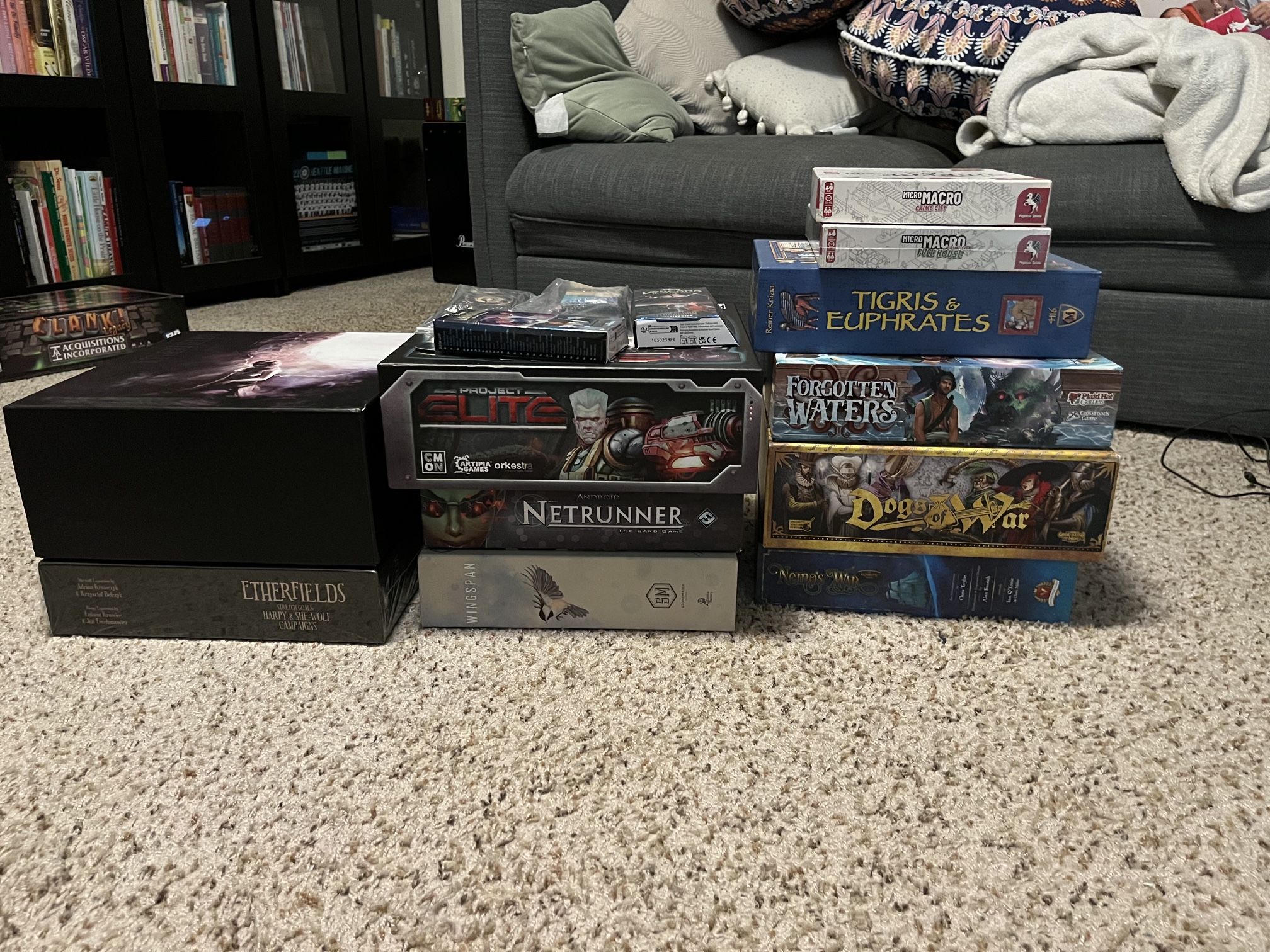 Project Elite [4] - only played once. $70 Nemo’s War: Ultimate Edition [4] - opened and organized, but never played. $70 Forgotten Waters [4] - opened, but unpunched. $30 Wingspan [4] - SOLD Android: Netrunner Base Game [3] - some wear on box. cards are sleeved $15 MicroMacro: Crime City [4] - only opened first couple envelopes MicroMacro: Full House [5] - NIS $30 total Etherfields [3] - one corner is slightly squished. One key is missing. Comes with Harpy and She-Wolf stretch goals [5] NIS $50 Lorcana (both sets) - SOLD
