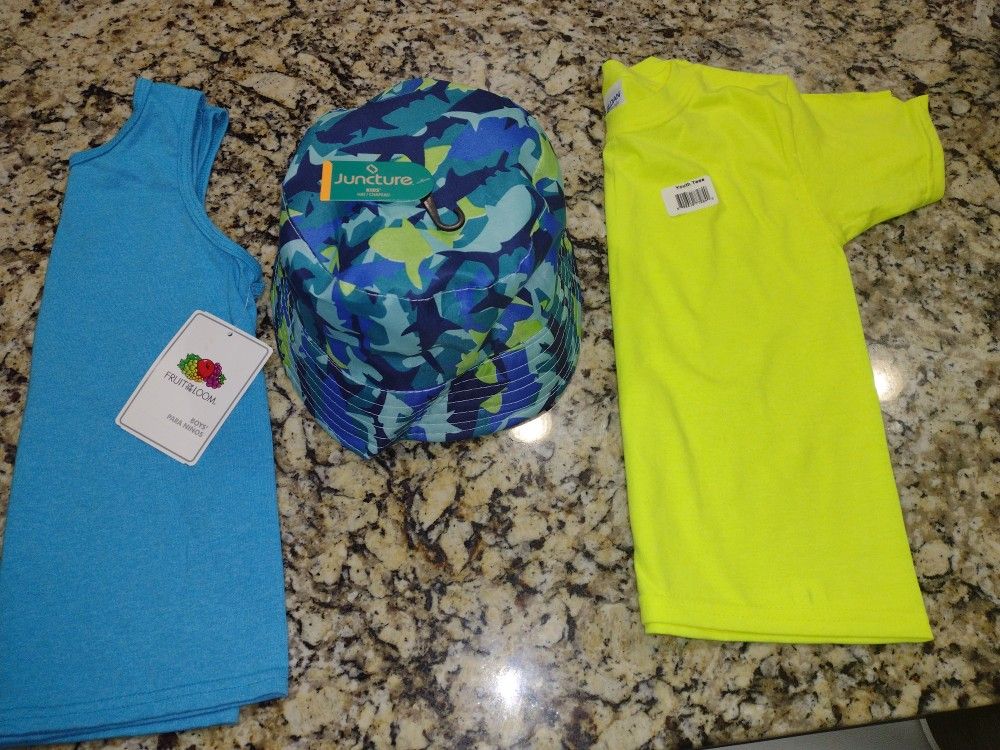 Enjoy the summer with this shark hat with one Sleeveless light blue shirt and one neon yellow Sleeveless shirt. Boy's shirt size 4-5.