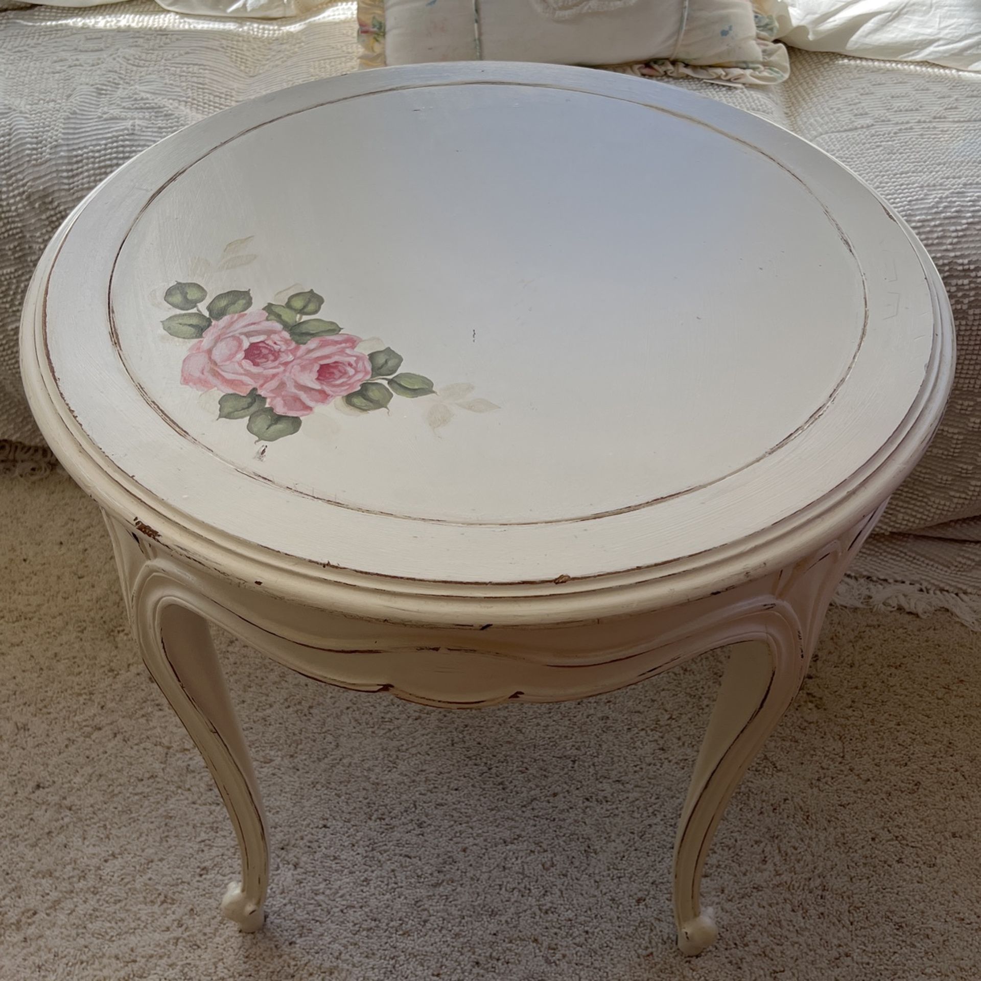 Shabby white with hand painted roses on top. Very nice carved wood detailing. Non smoking home 24” W x 23” H