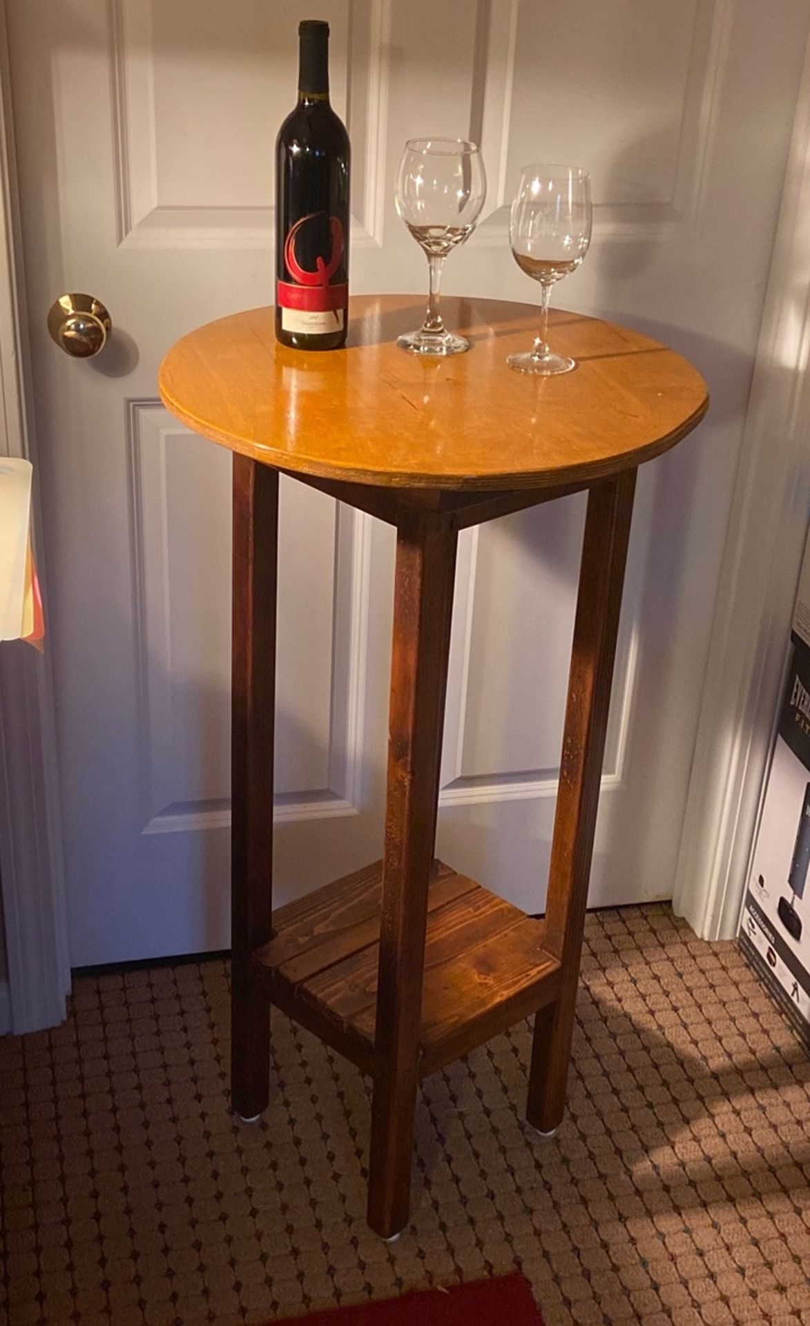 Bar height table 13’w x 13” deep x 39” high. Made of California redwood with 2 top coats of a satin urethane finish. Can be used in doors or outdoors. Has wood floor felt pads. Lightweight and has fixed bottom shelf . Cutting maple top and wine and glasses not included.