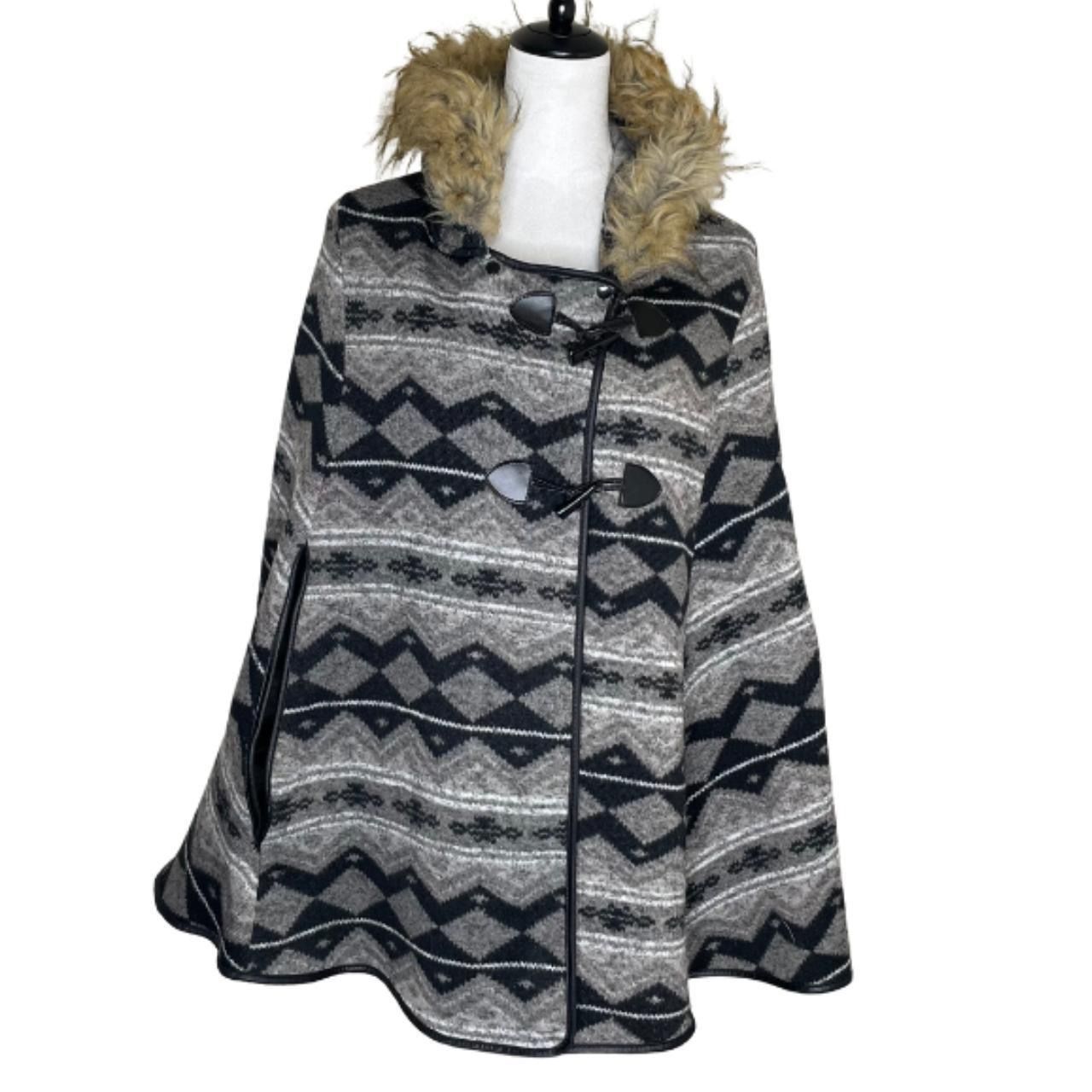 Women’s Faux Fur Hooded Parka Thick Shaw Poncho Southwestern Aztec Boho