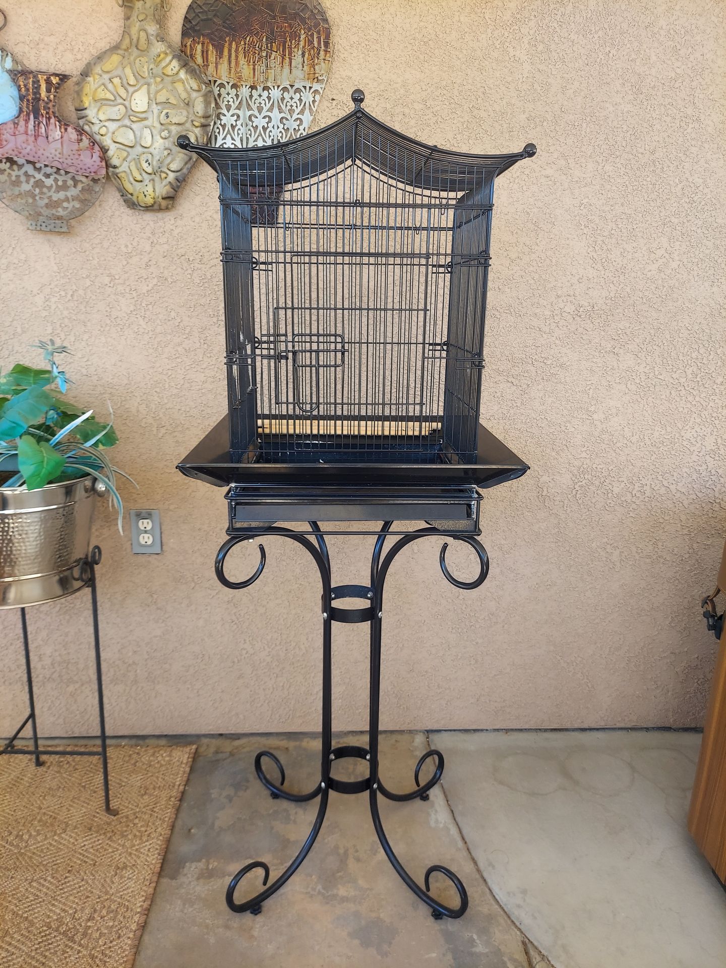 Removable cage: 26" H, 16" W, 14" D (Door: 9" H, 8" W) Stand: 34" H Total height with cage and stand: 58"
