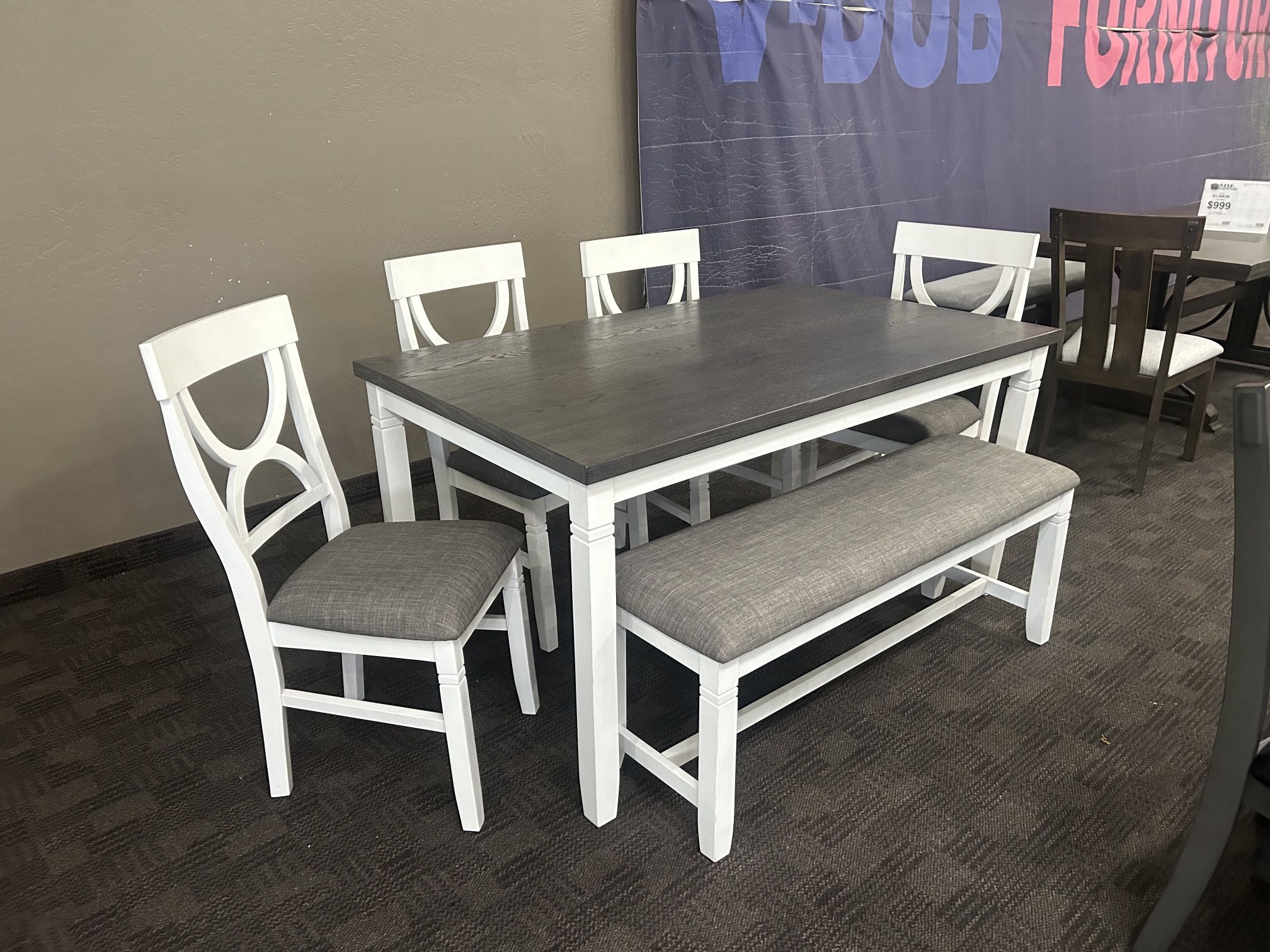 Brand new table four chairs and bench. Grey top with white. Pick up or have it delivered!