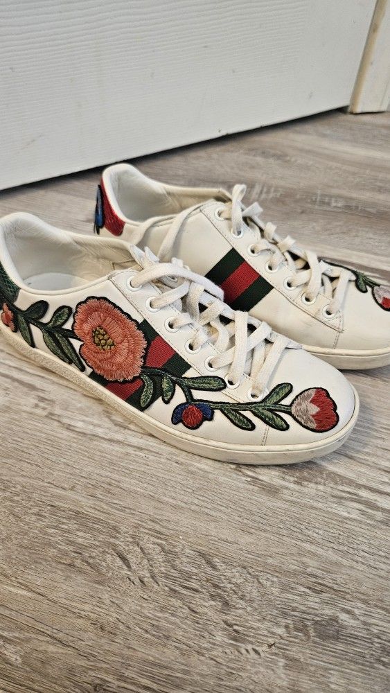 Pre Loved but still in good condition. Gucci embroidered flower sneakers. White leather with embroidered flowers. Size 37