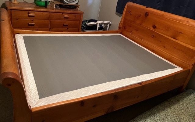 Queen Sleigh bed Solid Pine Clear coated stain Heavy duty Headboard 48” high Footboard 33” high Queen box spring included Located inTempe