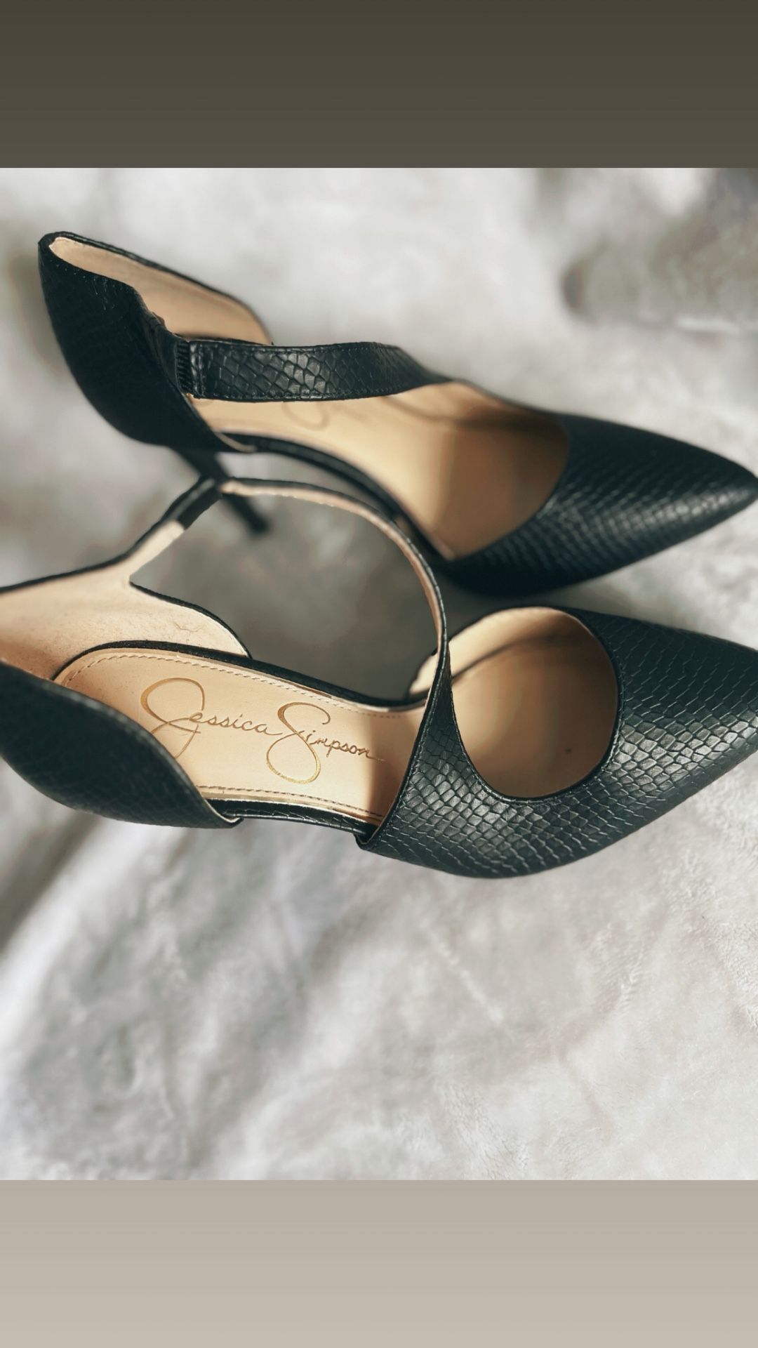 Jessica Simpson black pointed-toe heels with ankle strap. Classic, dressy style perfect for work, events, or nights out. Women’s size 6.5. Good condition with light wear only. Clean and well cared for. Local pickup preferred.